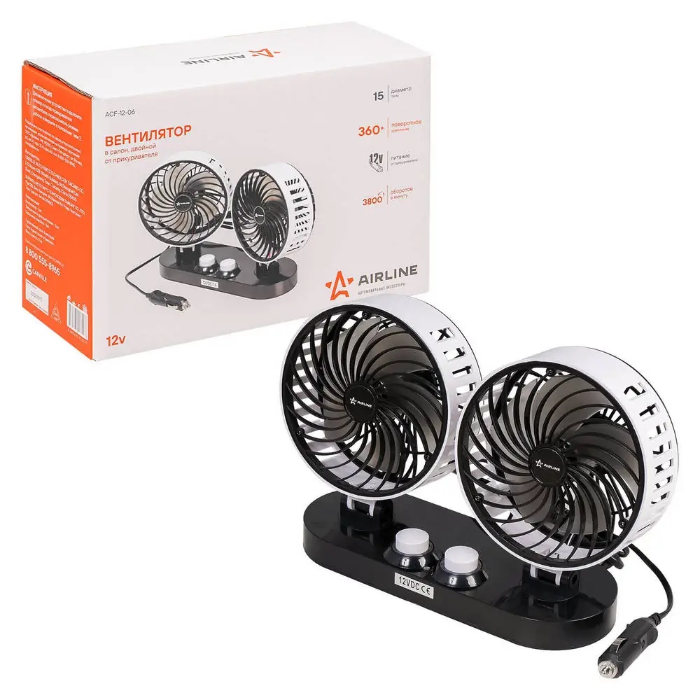 ACF-12-06 AIRLINE Вентилятор салонный 12В, 2х15"см (двойной, пластик, на скотч) /AIRLINE/