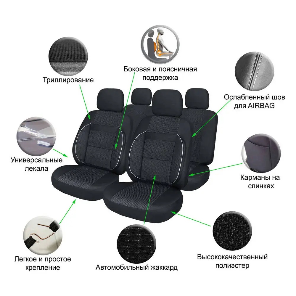 | Наименование | Чехлы для сидений универсальные MONRO, 11 пред., повыш. комфорт, жаккард, черн. |