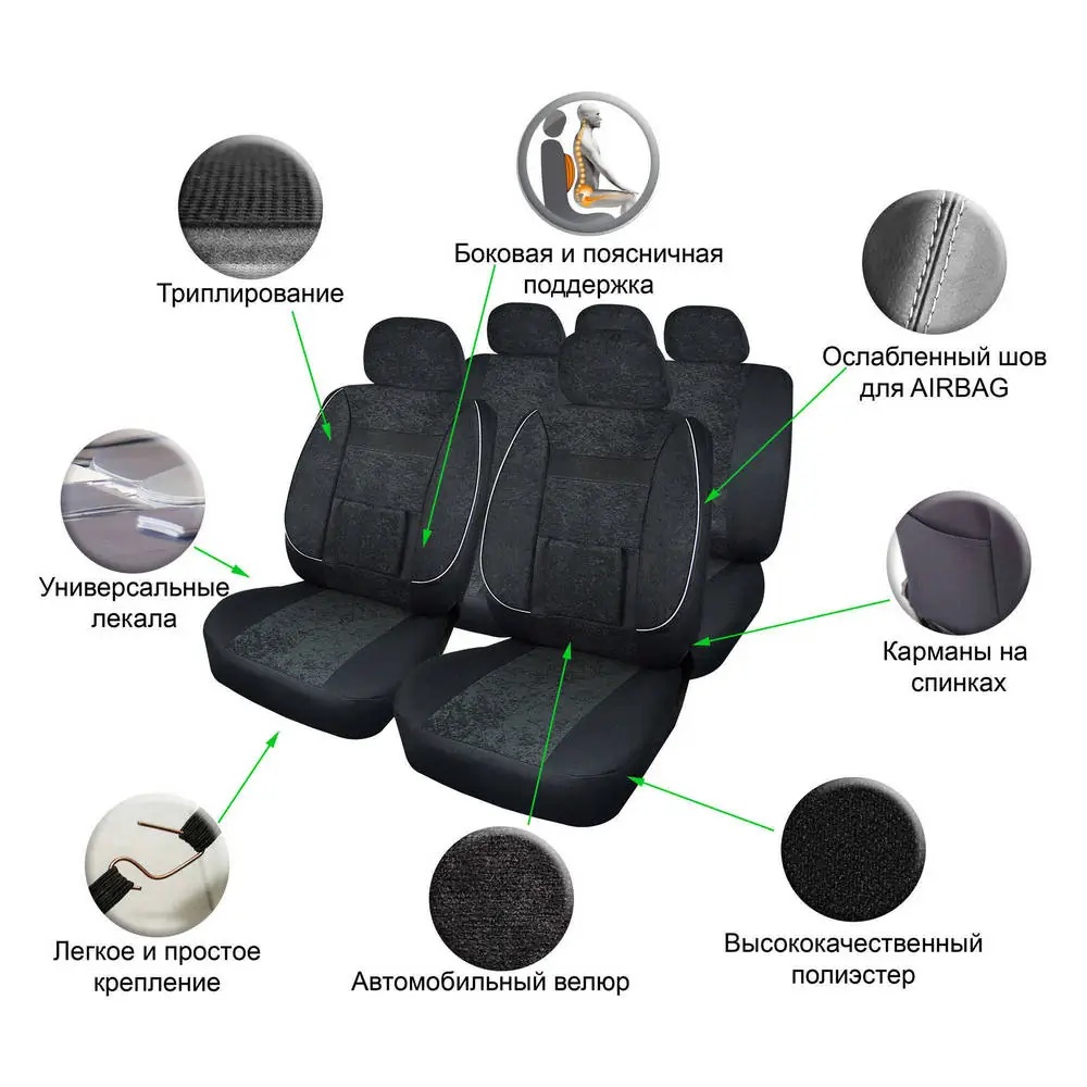 | Наименование | Авточехлы универсальные велюр черные (11 предм.) Monro AIRLINE |