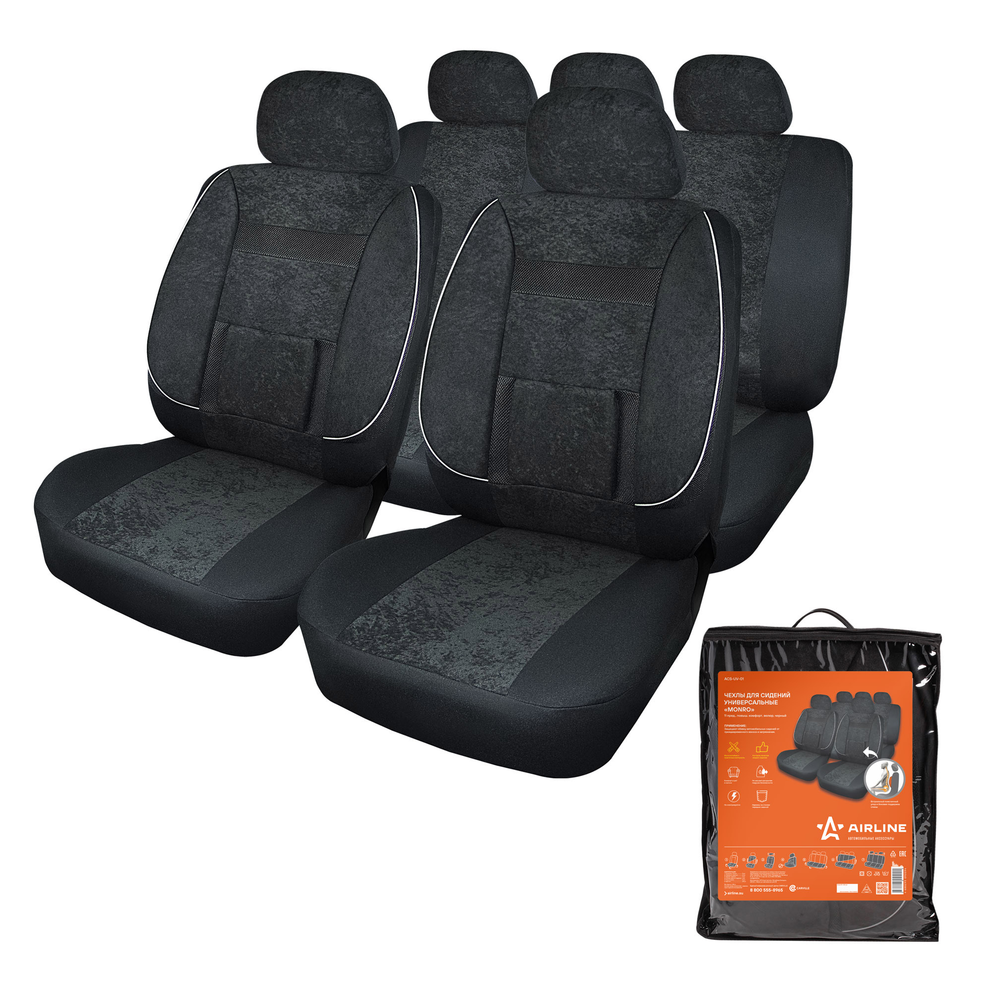 ACS-UV-01 AIRLINE Авточехлы универсальные велюр черные (11 предм.) Monro AIRLINE
