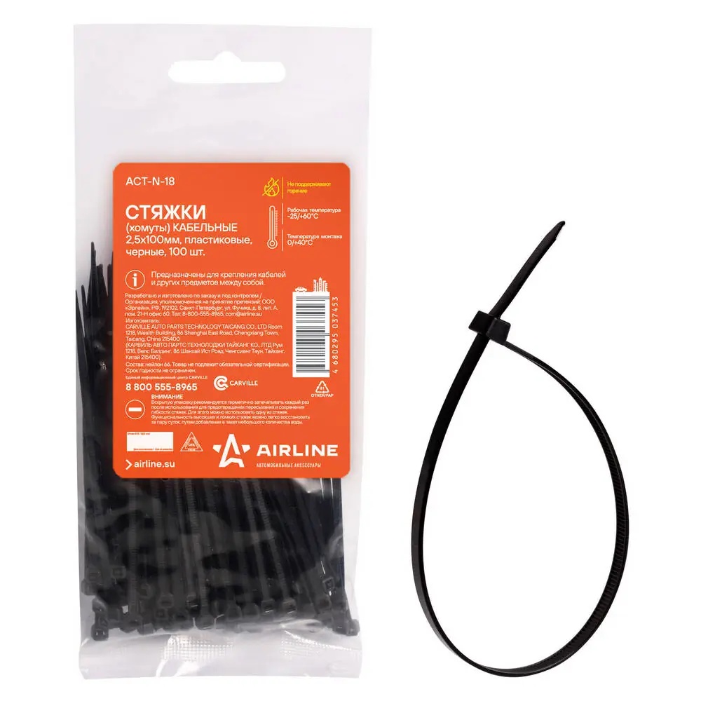 ACT-N-18 AIRLINE Стяжки (хомуты) кабельные 2,5*100 мм, пластиковые, черные, 100 шт. ACT-N-18
