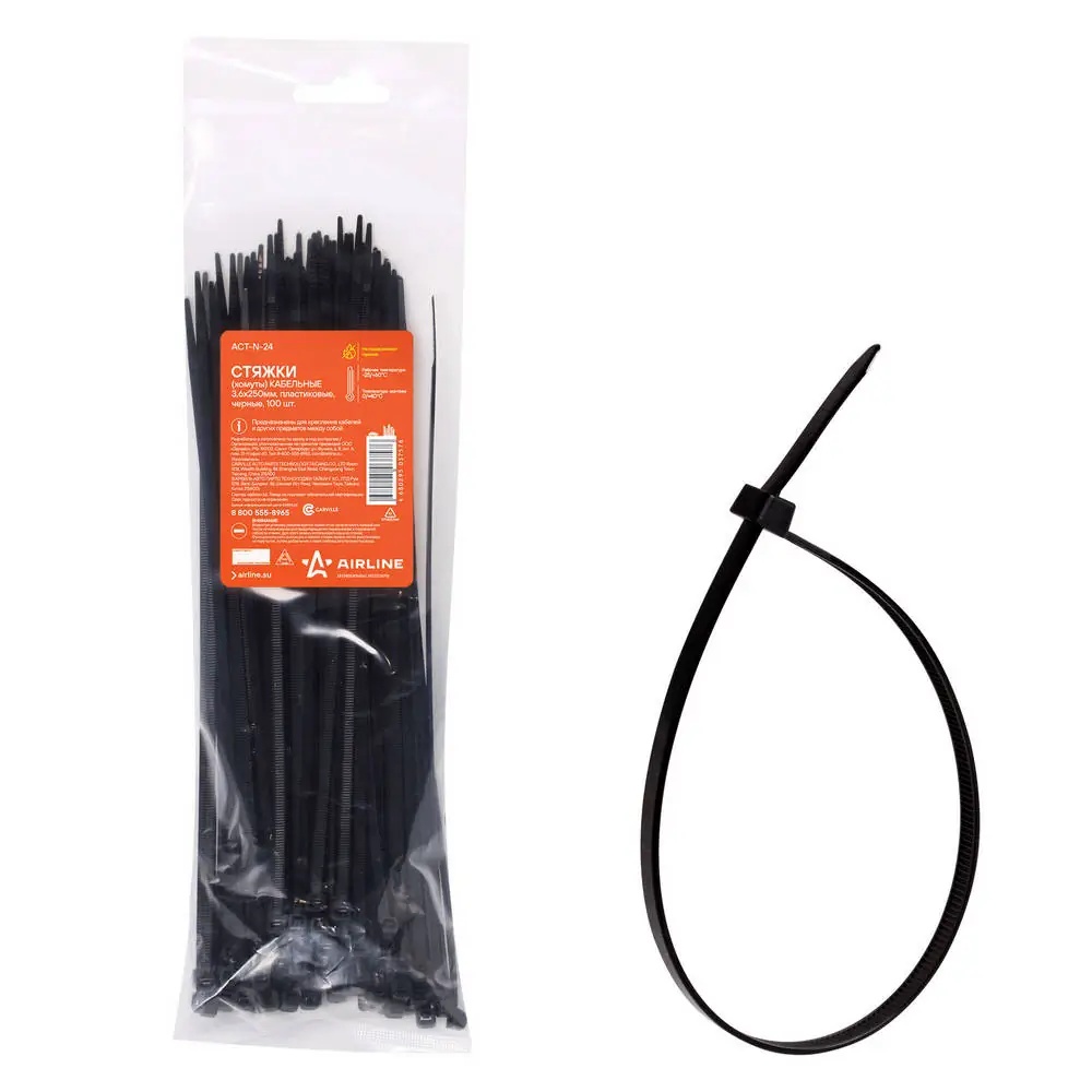 ACT-N-24 AIRLINE Стяжки (хомуты) кабельные 3,6*250 мм, пластиковые, черные, 100 шт. ACT-N-24