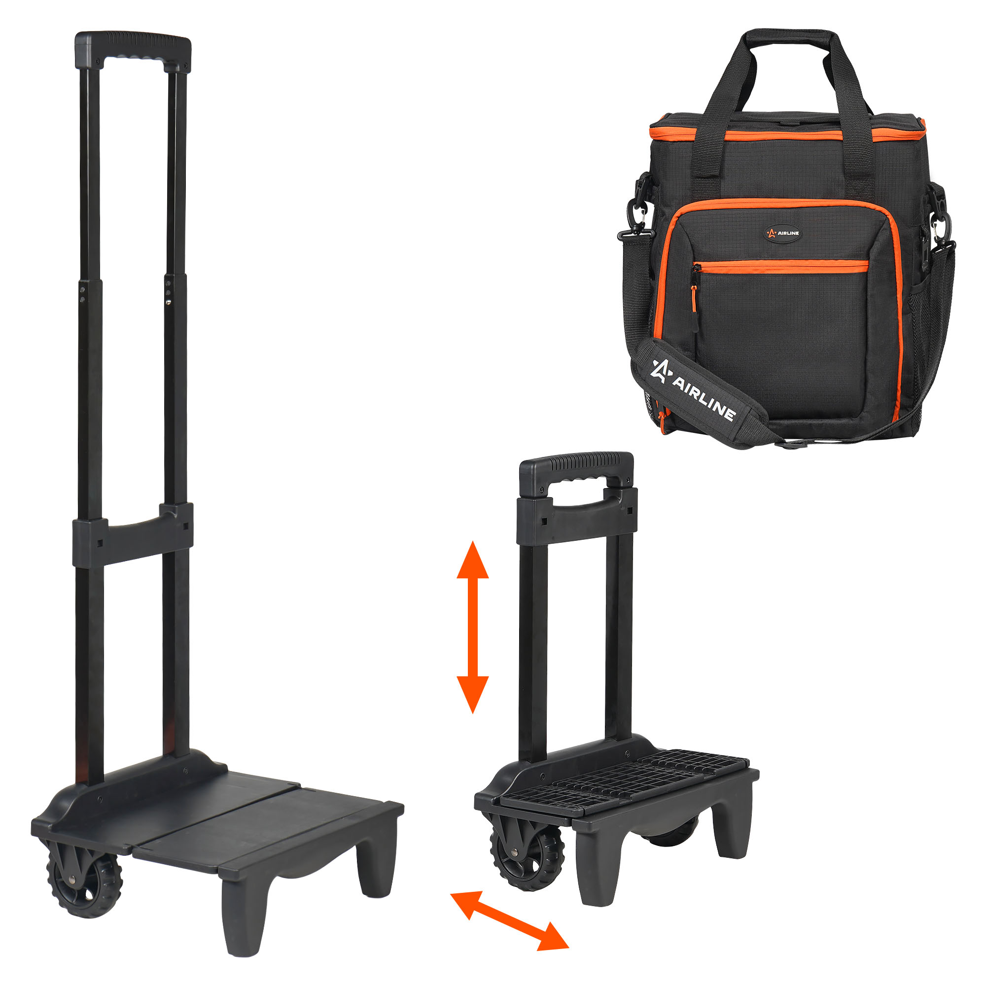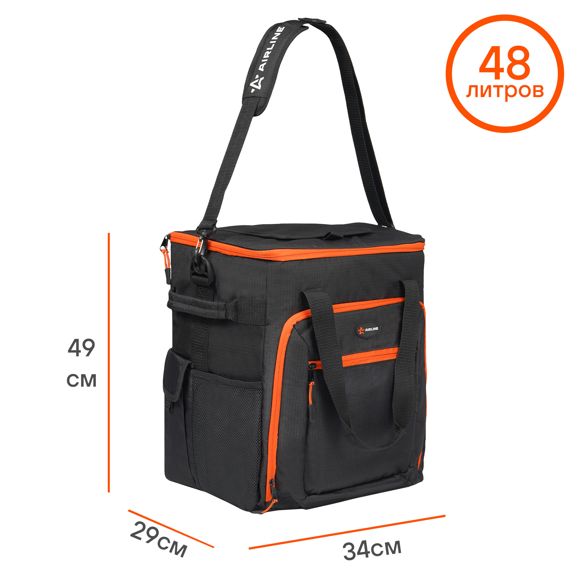 | Наименование | Сумка изотермическая 48л 34х48х10см черно-оранжевая на колесах AIRLINE |