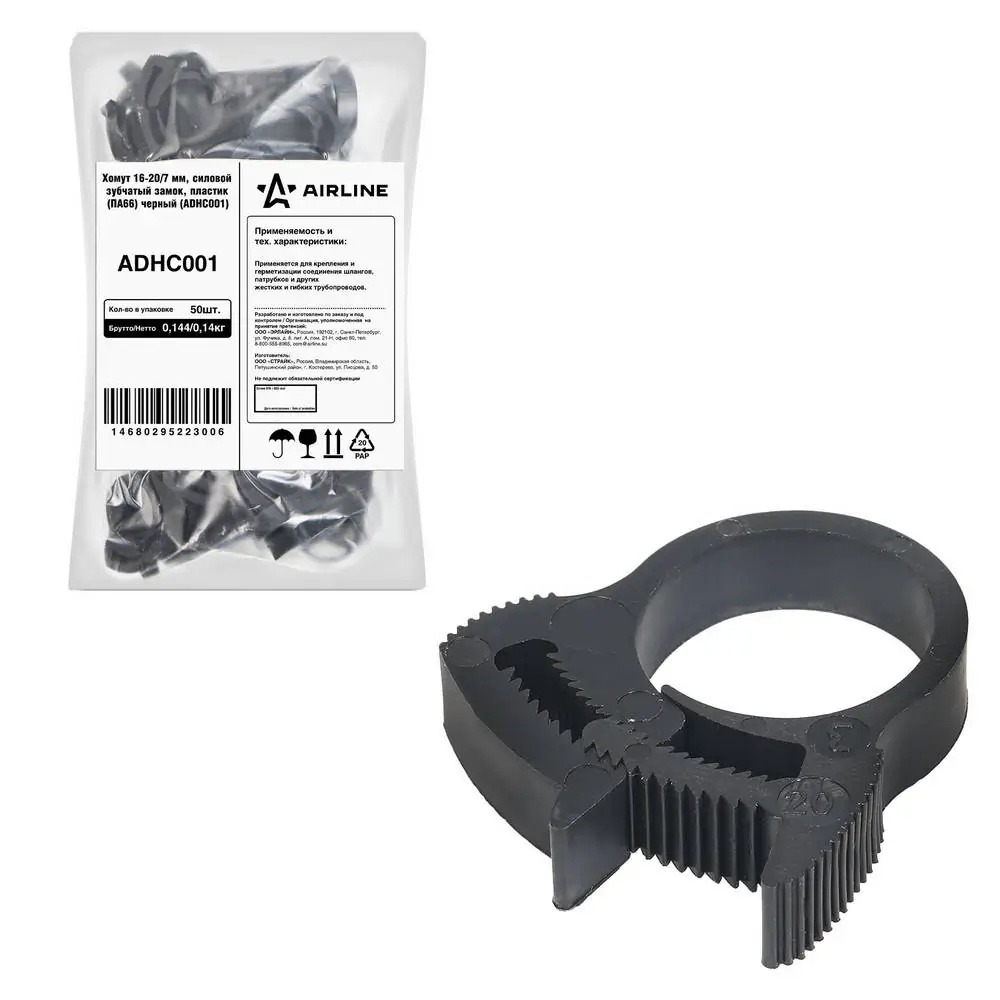 ADHC001 AIRLINE Хомут 16-20/7 мм, силовой зубчатый замок, пластик (ПА66) черный AIRLINE