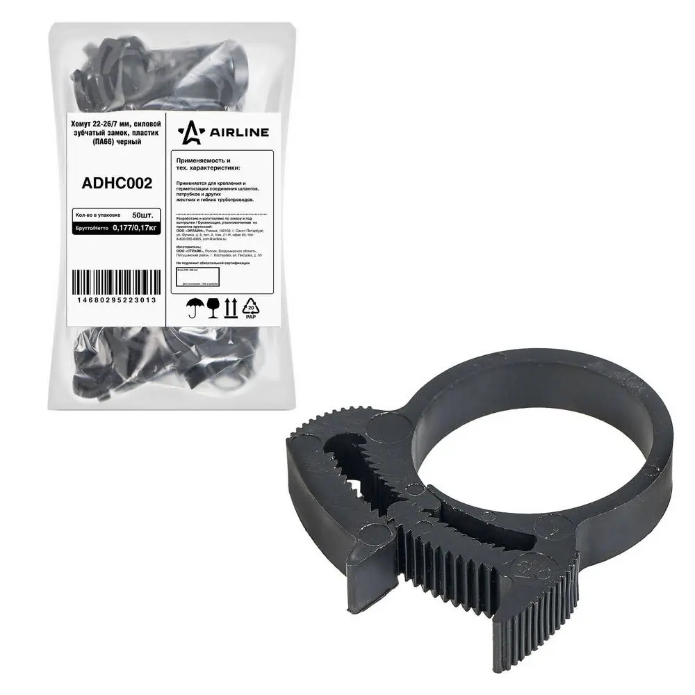 ADHC002 AIRLINE Хомут 22-26/7 мм, силовой зубчатый замок, пластик (ПА66) черный AIRLINE