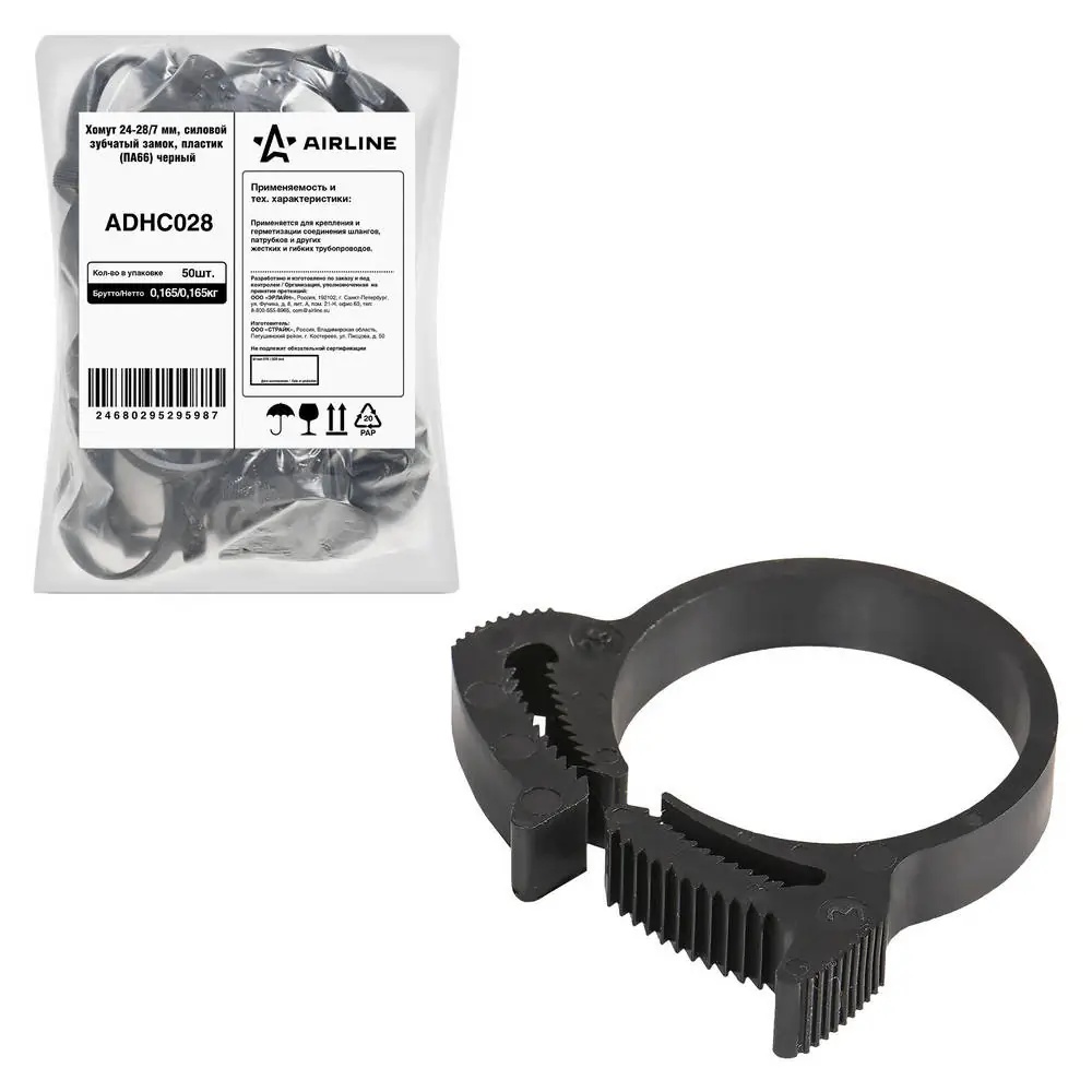 | Наименование | Хомут на патрубки AIRLINE силовой 24-28 мм (пластик ПА66, зубчатый замок, черный |