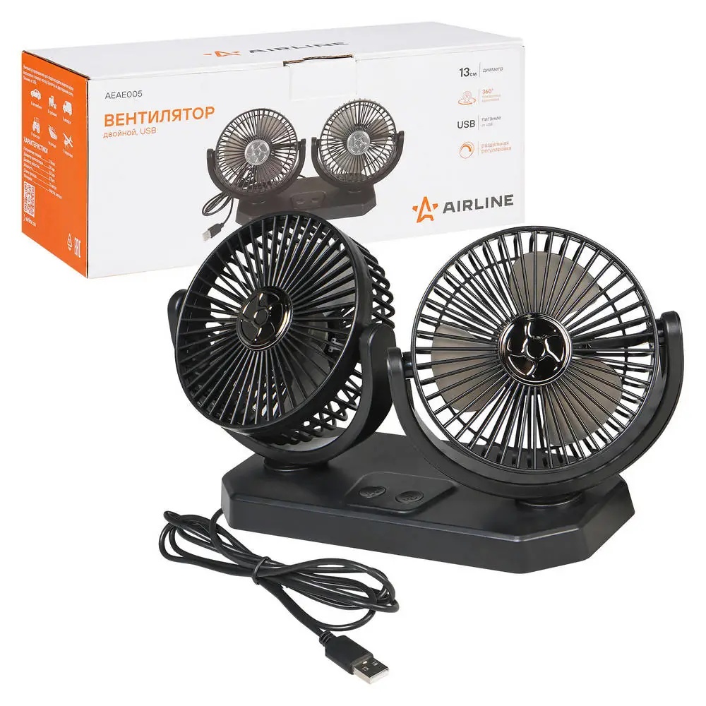 AEAE005 AIRLINE Вентилятор в салон двойной поворотный 360, 2x13см, 5В USB, раздельная регулировк