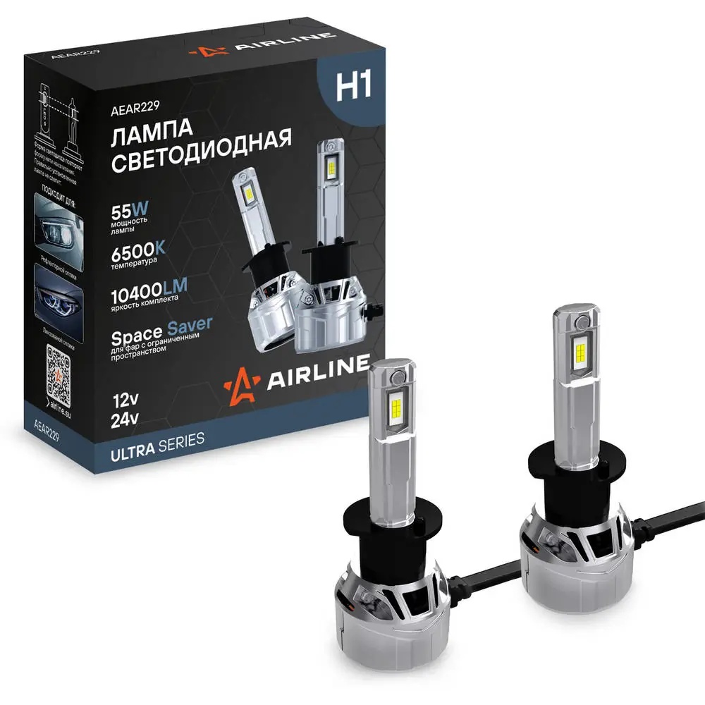 AEAR229 AIRLINE Лампа светодиод. H1 ULTRA, 55Вт, 10400Лм (5200Лм x 2), 6500К, 12/24В, кмпл. 2 шт