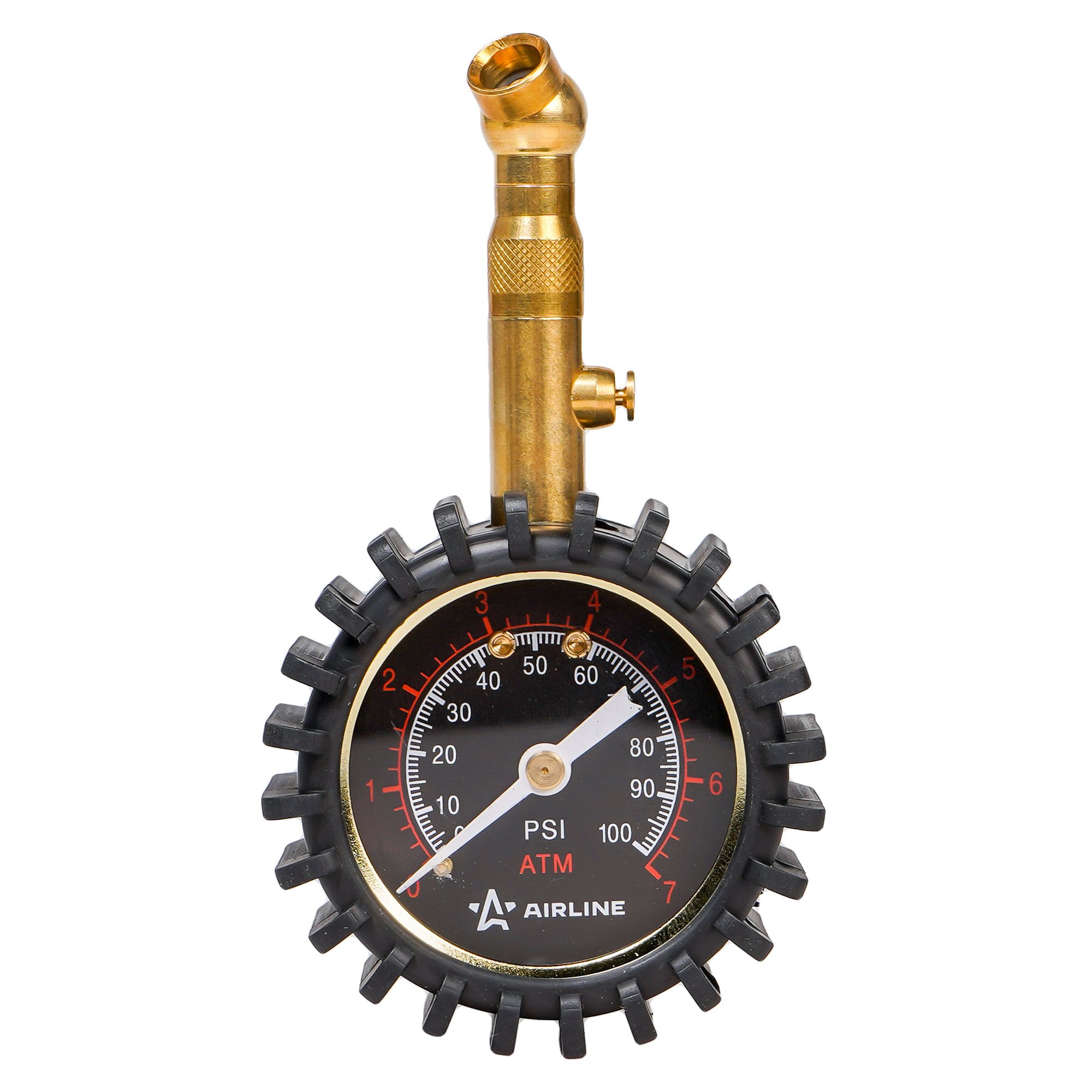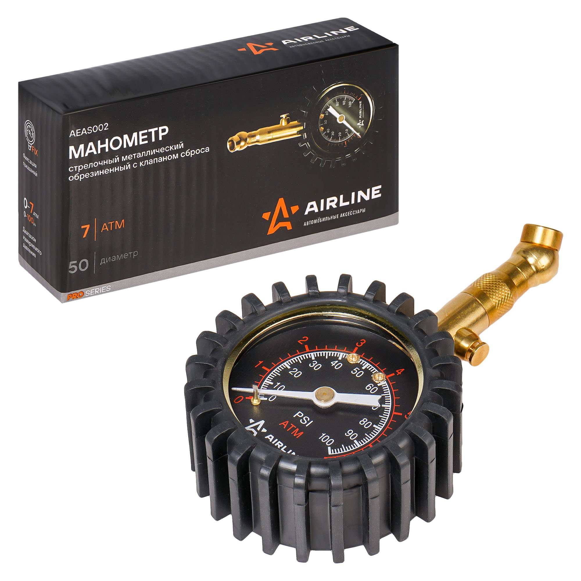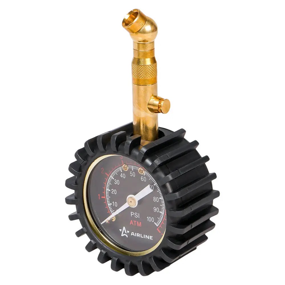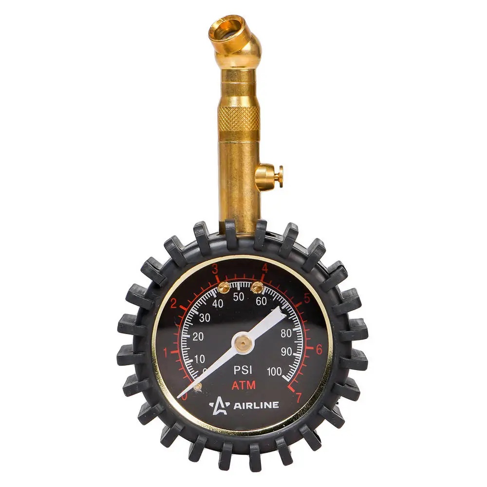 AEAS002 AIRLINE Манометр шинный ( 7атм) металл (50мм, обрезиненный, клапан сброса) /AIRLINE/