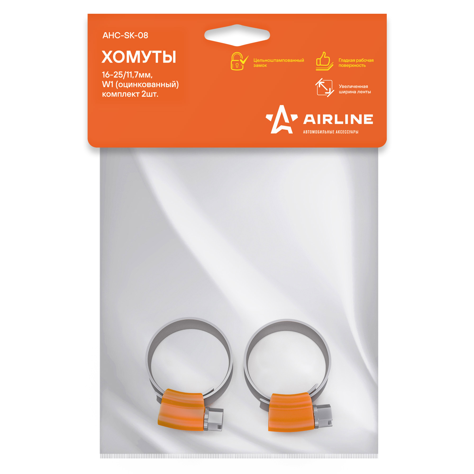 AHC-SK-08 AIRLINE Хомуты 16-25/11,7 мм, червячные, усиленные, W1 (оцинк.), комплект 2 шт. (AHC-SK-