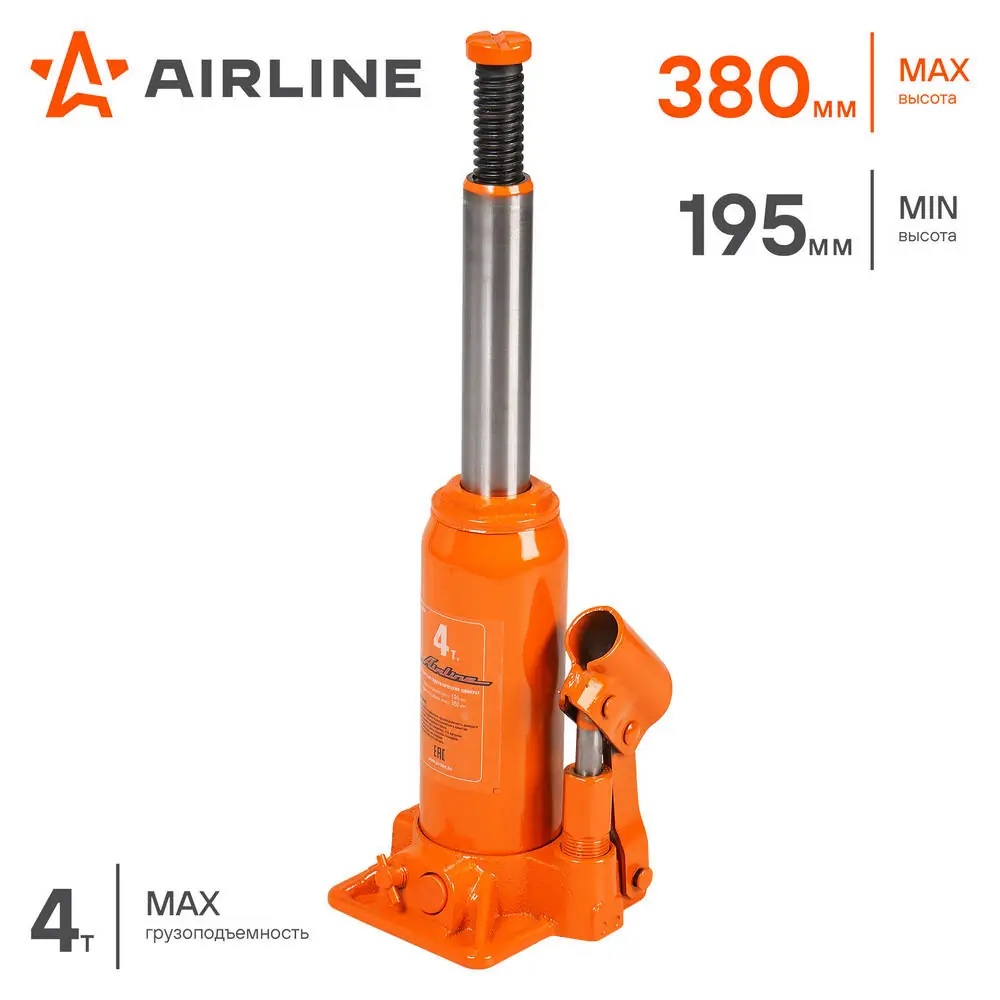 | Наименование | Домкрат бутылочный 4 т AIRLINE 195 - 380 мм в кейсе |