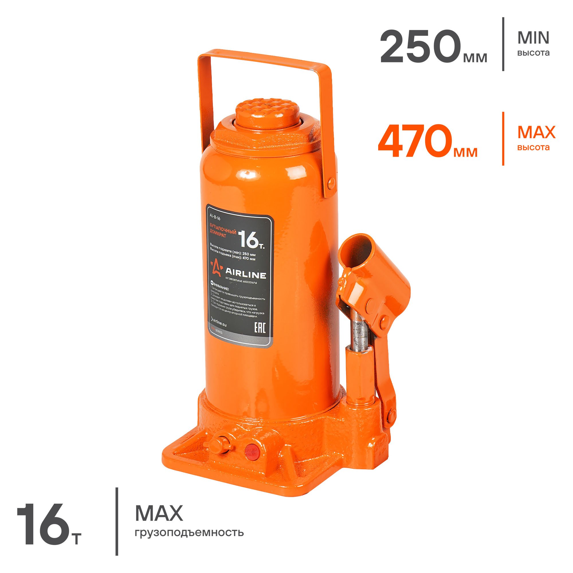 AJ-B-16 AIRLINE Домкрат 16,0т бутылочный (250-490мм) /AIRLINE/