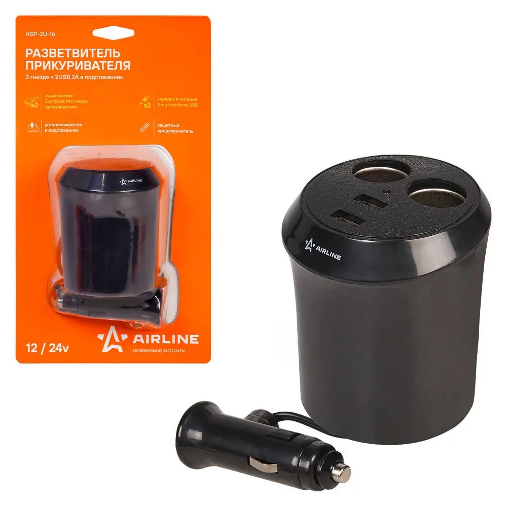 ASP-2U-16 AIRLINE Разветвитель в прикуриватель "AIRLINE" (2 гнезда 2USB в подстаканник)