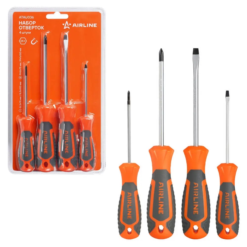 ATAU036 AIRLINE Набор отвёрток ( 4 предмета) "AIRLINE" (SL3x75, SL5x100, PH0x75, PH1x100) блисте