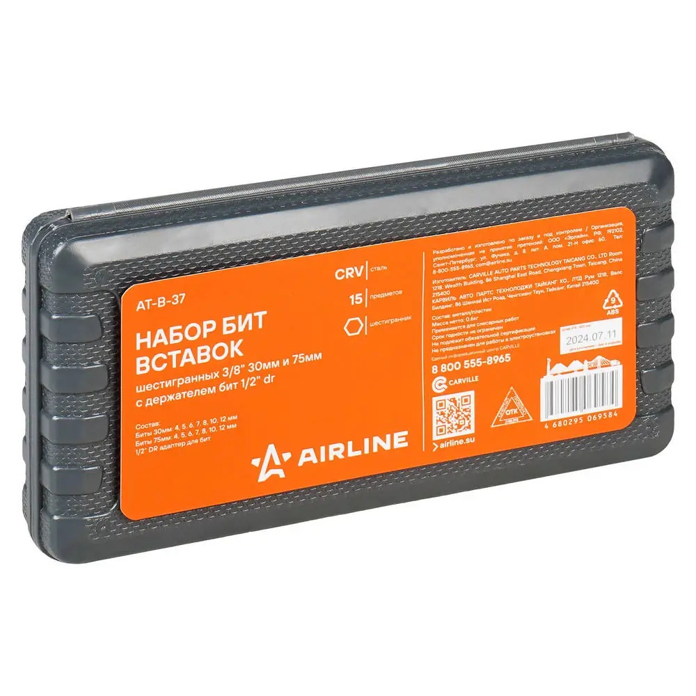 ATB37 AIRLINE Набор бит вставок шестигранных 3/8 30мм и 75мм с держателем бит 1/2 DR 15 предме