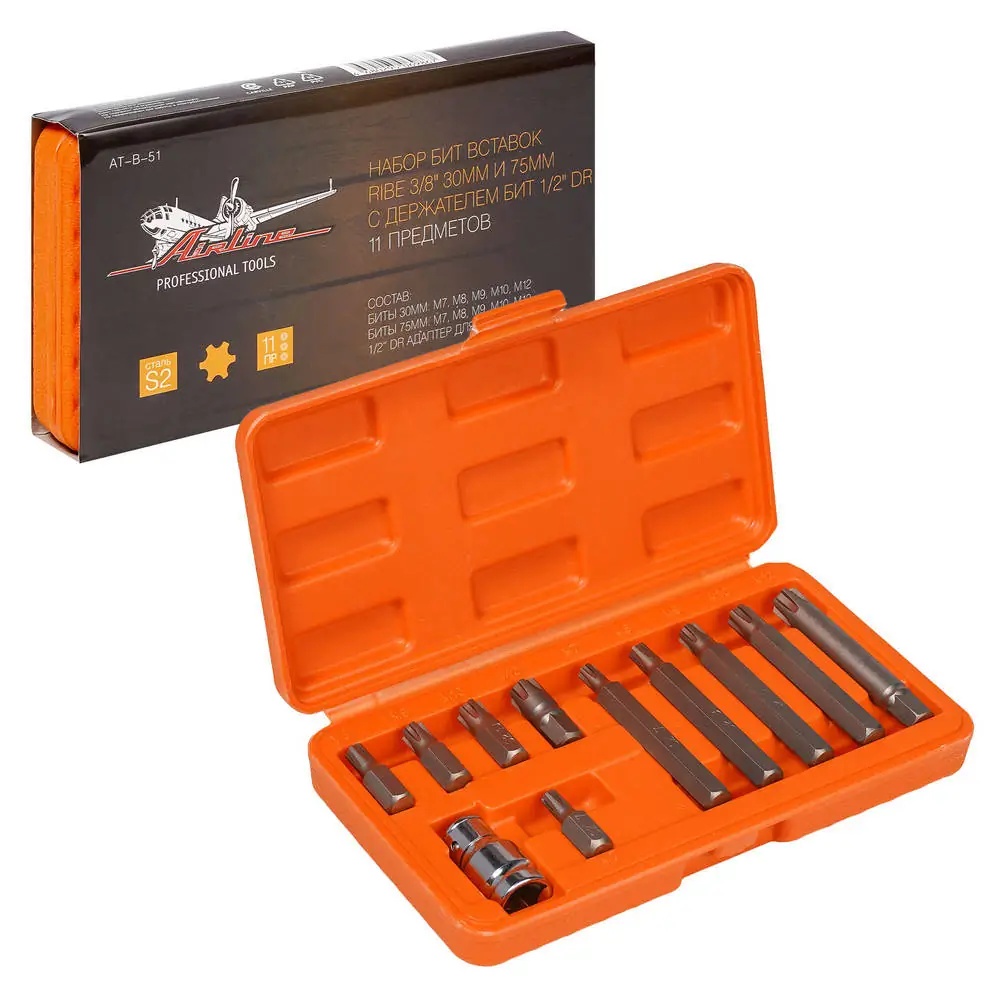 AT-B-50 AIRLINE Набор бит вставок SPLINE 3/8 30мм и 75мм с держателем бит 1/2 DR 11 предметов в