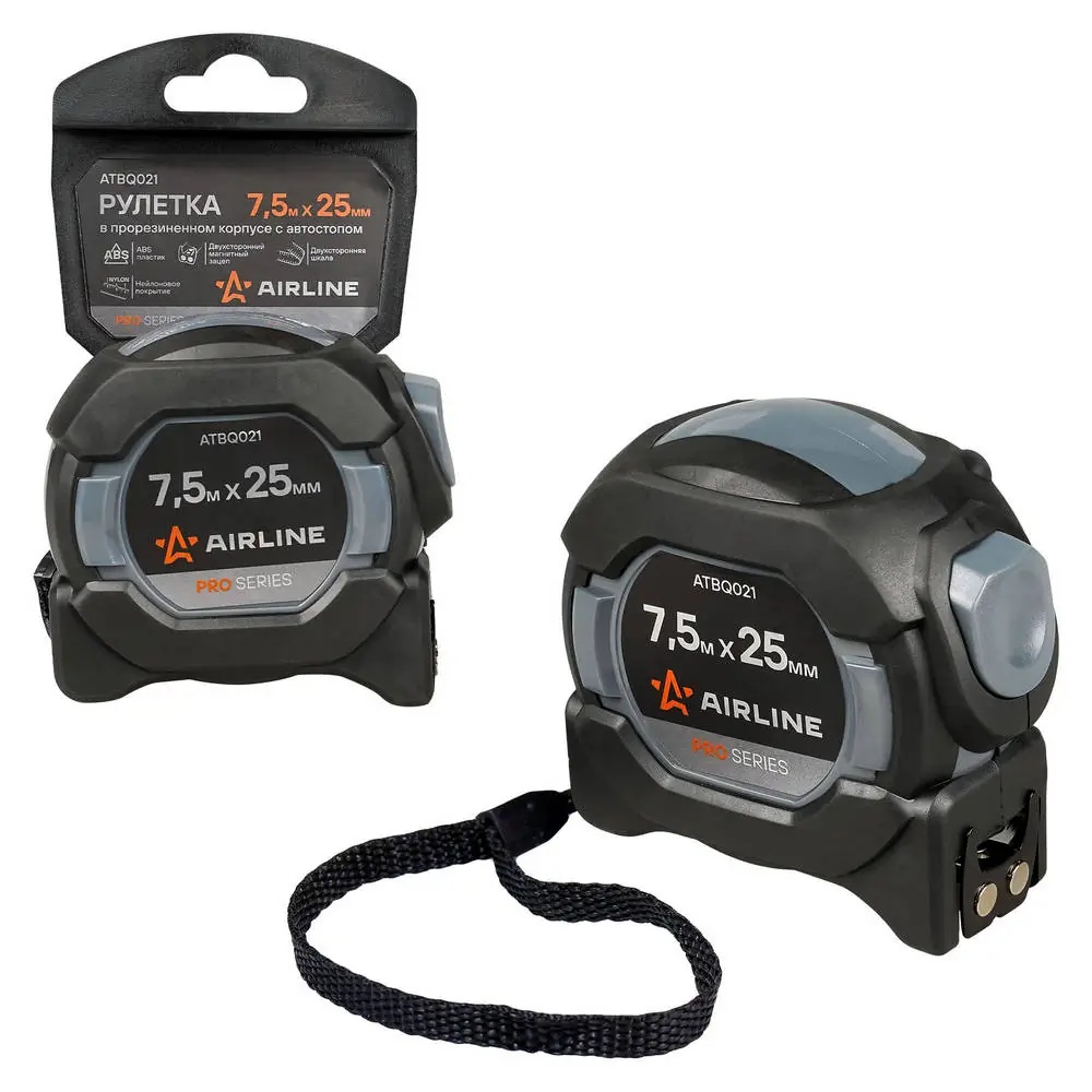 ATBQ021 AIRLINE Рулетка 7.5м 25мм двухкомпонентный корпус,двухсторонние шкала и магнит.зацеп,авт