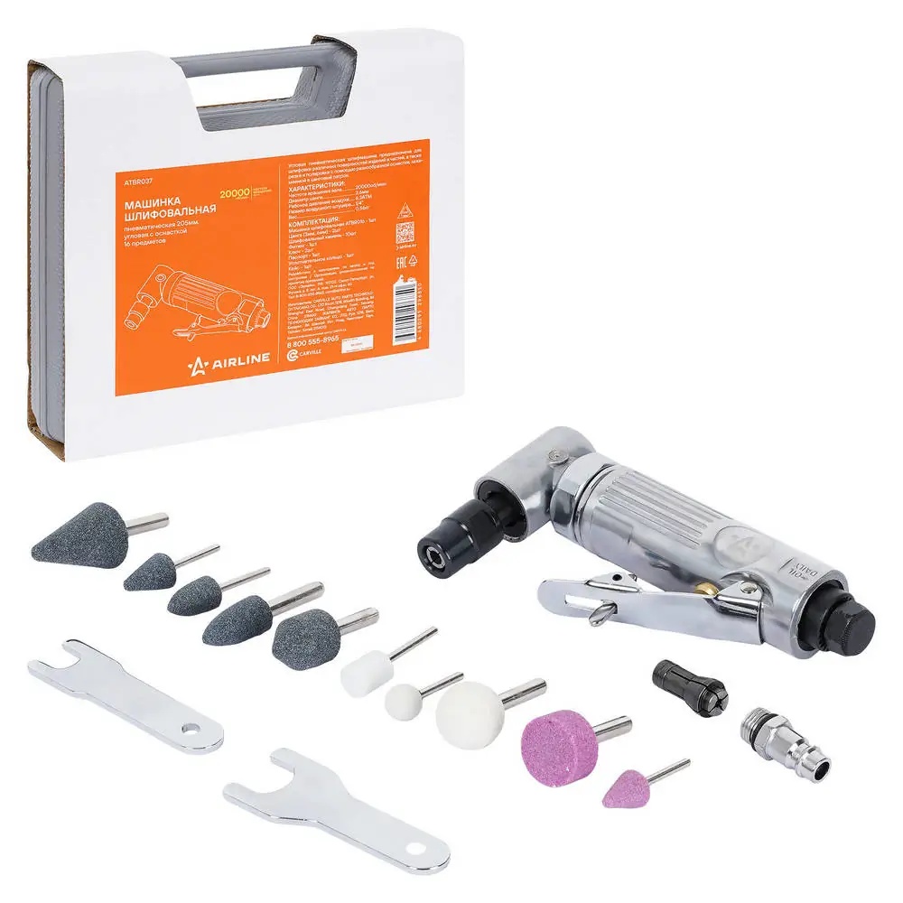 ATBR037 AIRLINE Машинка шлифовальная пневматическая 200мм, 20000об/мин угловая с оснасткой 16 пр