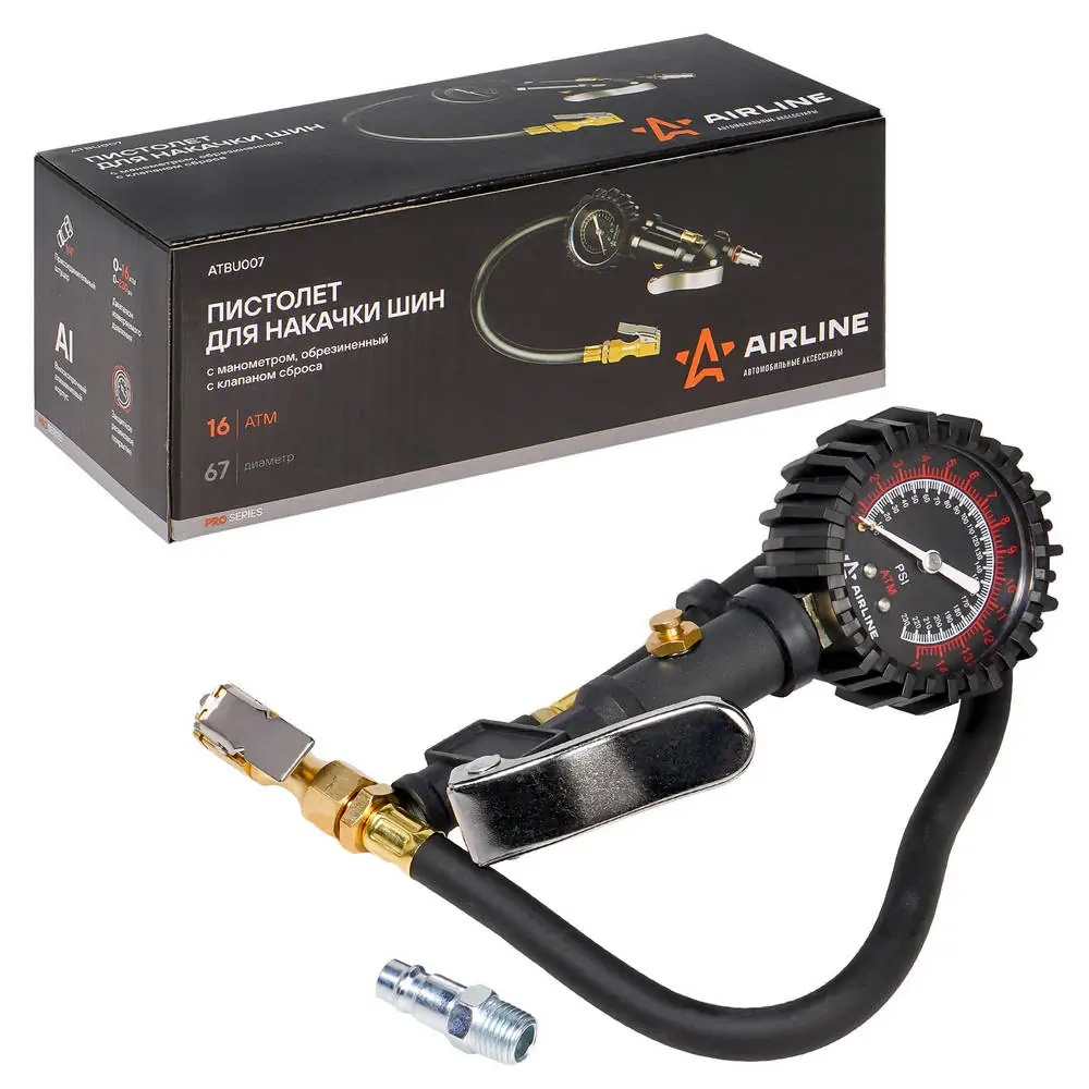 ATBU007 AIRLINE Пистолет для накачки шин с манометром 16АТМ обрезин. с клапаном сброса PRO ATBU0