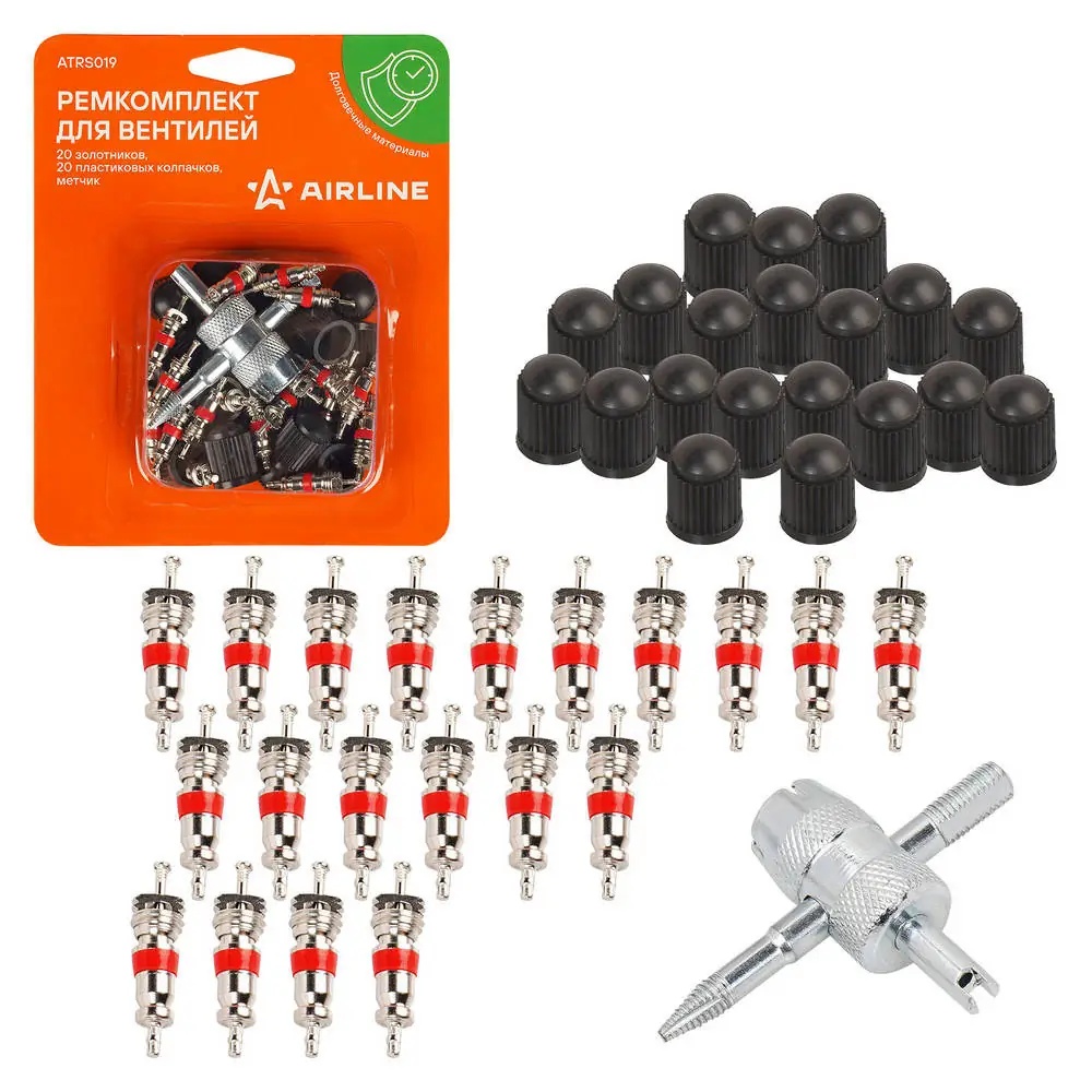ATRS019 AIRLINE Ремкомплект для вентилей (20 золотников, 20 пласт. колп., 1 метчик) в блистере (