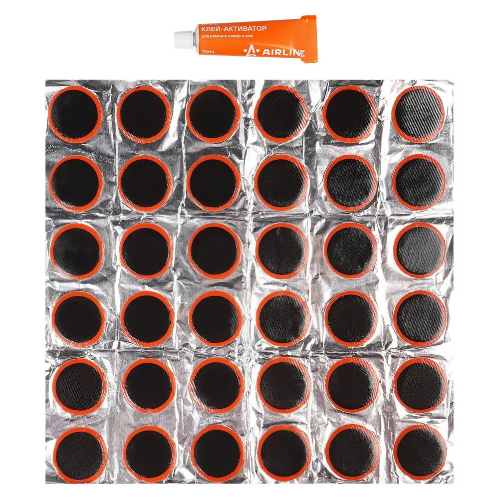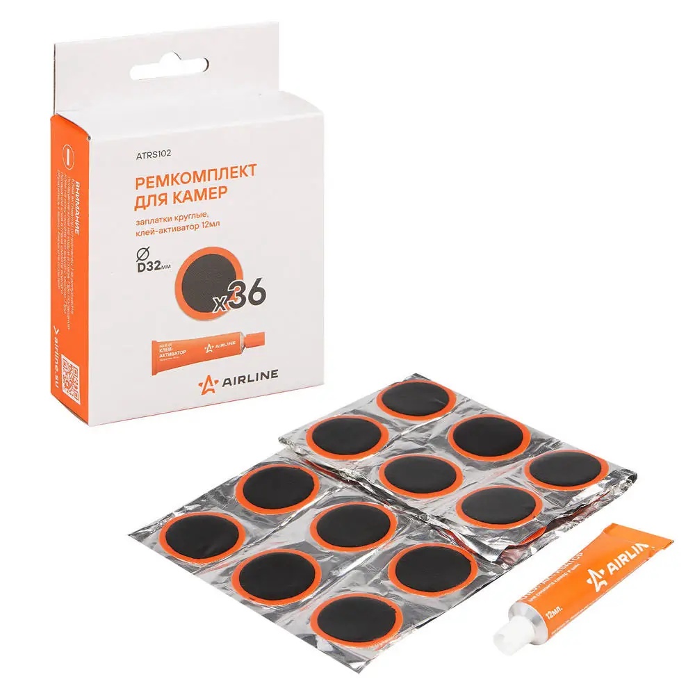 ATRS102 AIRLINE Ремкомплект для камер, заплатки круглые D32 мм - 36 шт., клей-активатор 12мл (AT