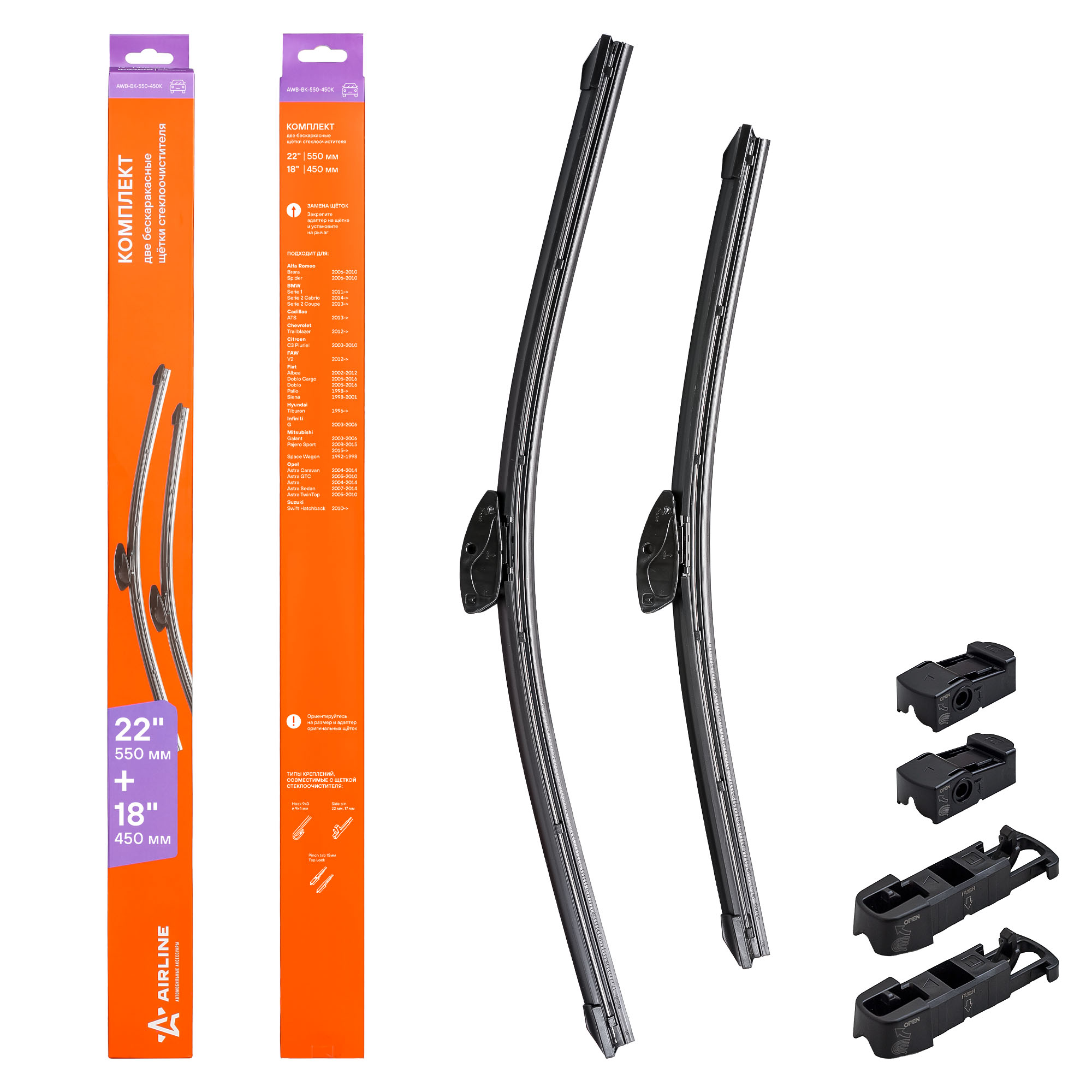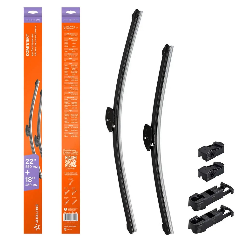 AWB-BK-550-450K AIRLINE Щетки стеклоочистителя 550,450мм 22"",18"" бескаркасные,BMW1 11-,Pajero Sport 08