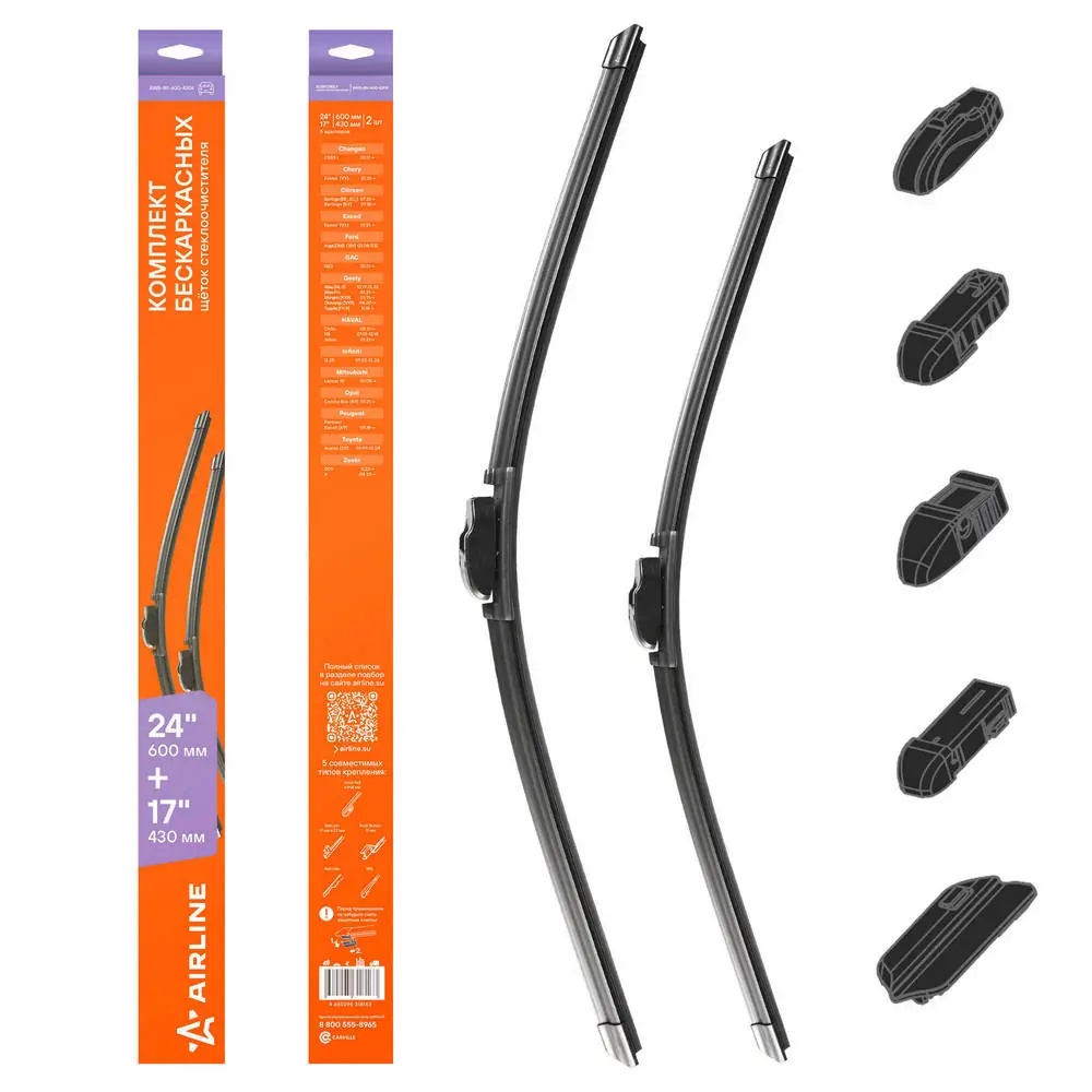 AWBBK600430K AIRLINE Щетки стеклооч компл. (2шт.) 600/430мм (24/17) бескаркас 5 адптр (AWB-BK-600-430