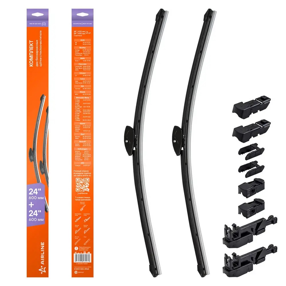 AWB-BK-600-600K AIRLINE Щетки стеклоочистителя бескаркасные 600/600мм (24/24) 2 шт. 5 адптр