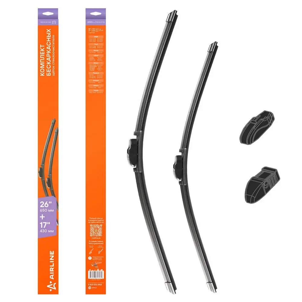 AWB-BK-650-430K AIRLINE Щетки стеклоочистителя бескаркасные 650/430мм 2 адптр