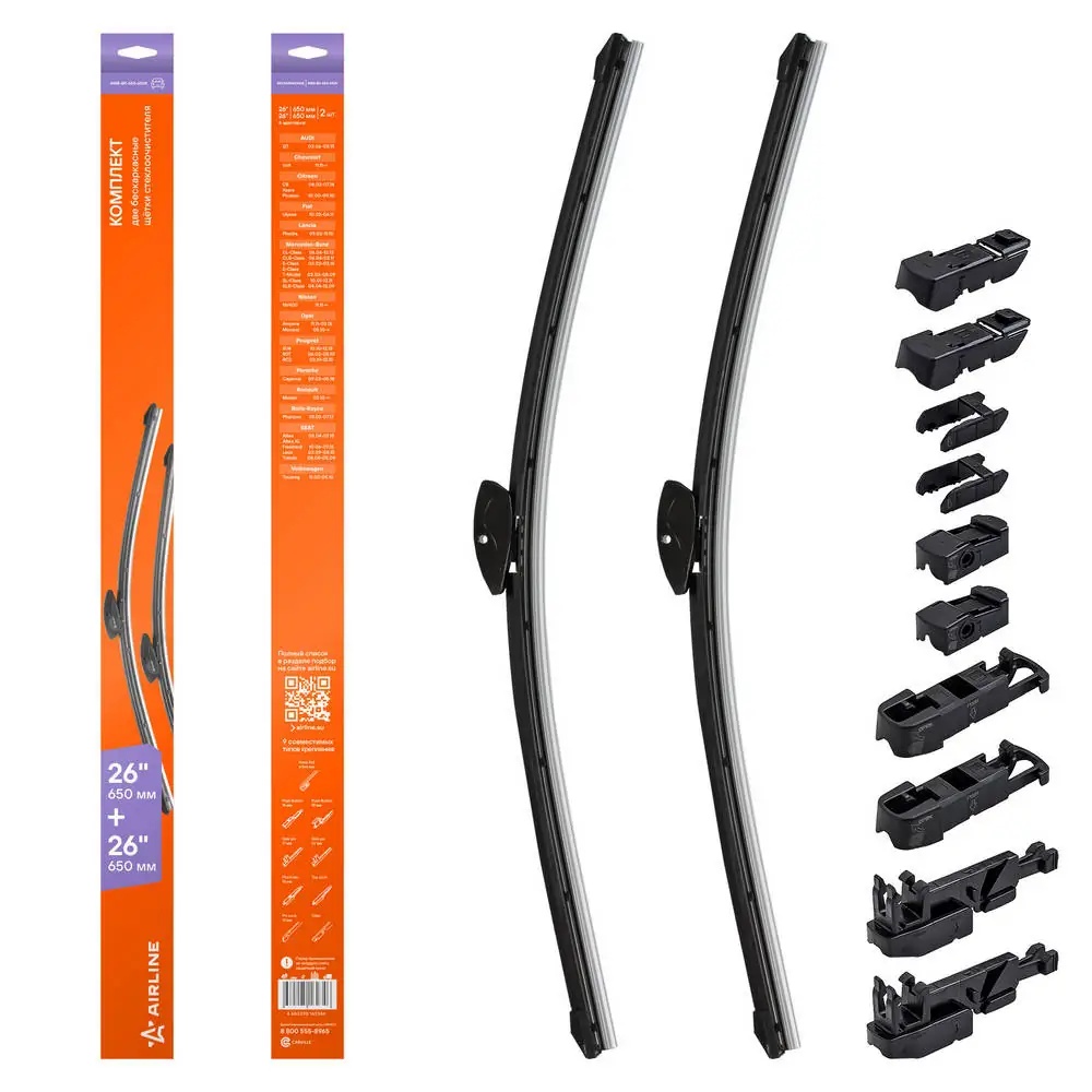 AWB-BK-650-650K AIRLINE Щетки стеклоочистителя бескаркасные 650/650мм (26/26) 2 шт. 6 адптр