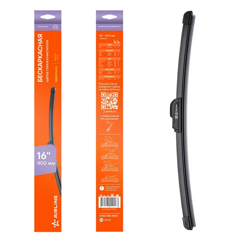 AWB-BKP-410 AIRLINE Щетка стеклоочистителя 410мм 16 бескаркасная, 1 адаптеркрючок 9х3 AWB-BKP-410