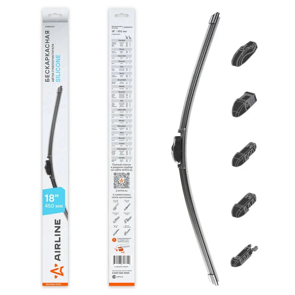 AWBBS006 AIRLINE Щетка стеклоочистителя бескаркасная Silicone 450мм 5 адаптеров