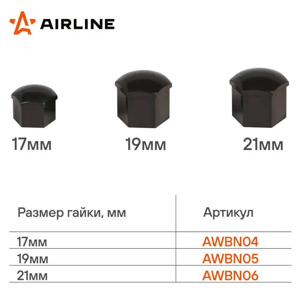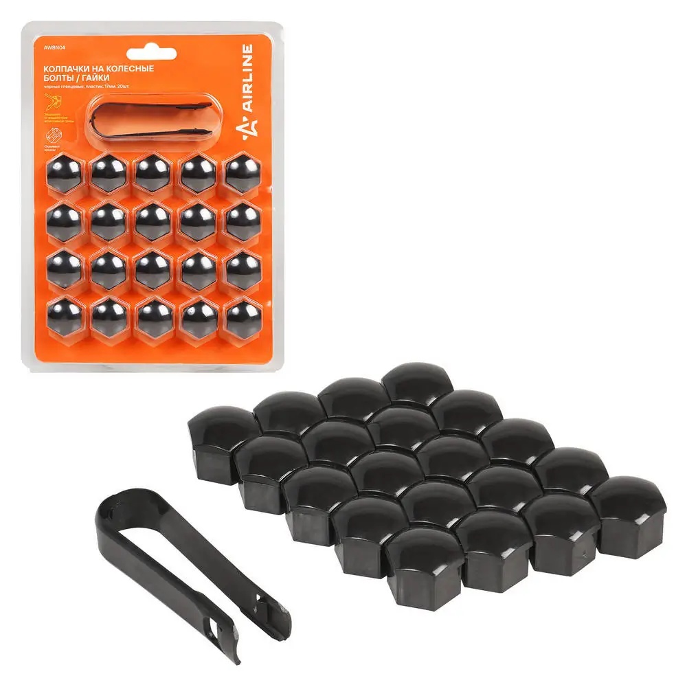 AWBN04 AIRLINE Колпачки на колесные болты/гайки 17 мм, черные глянцевые, пластик, 20 шт.+ съёмн