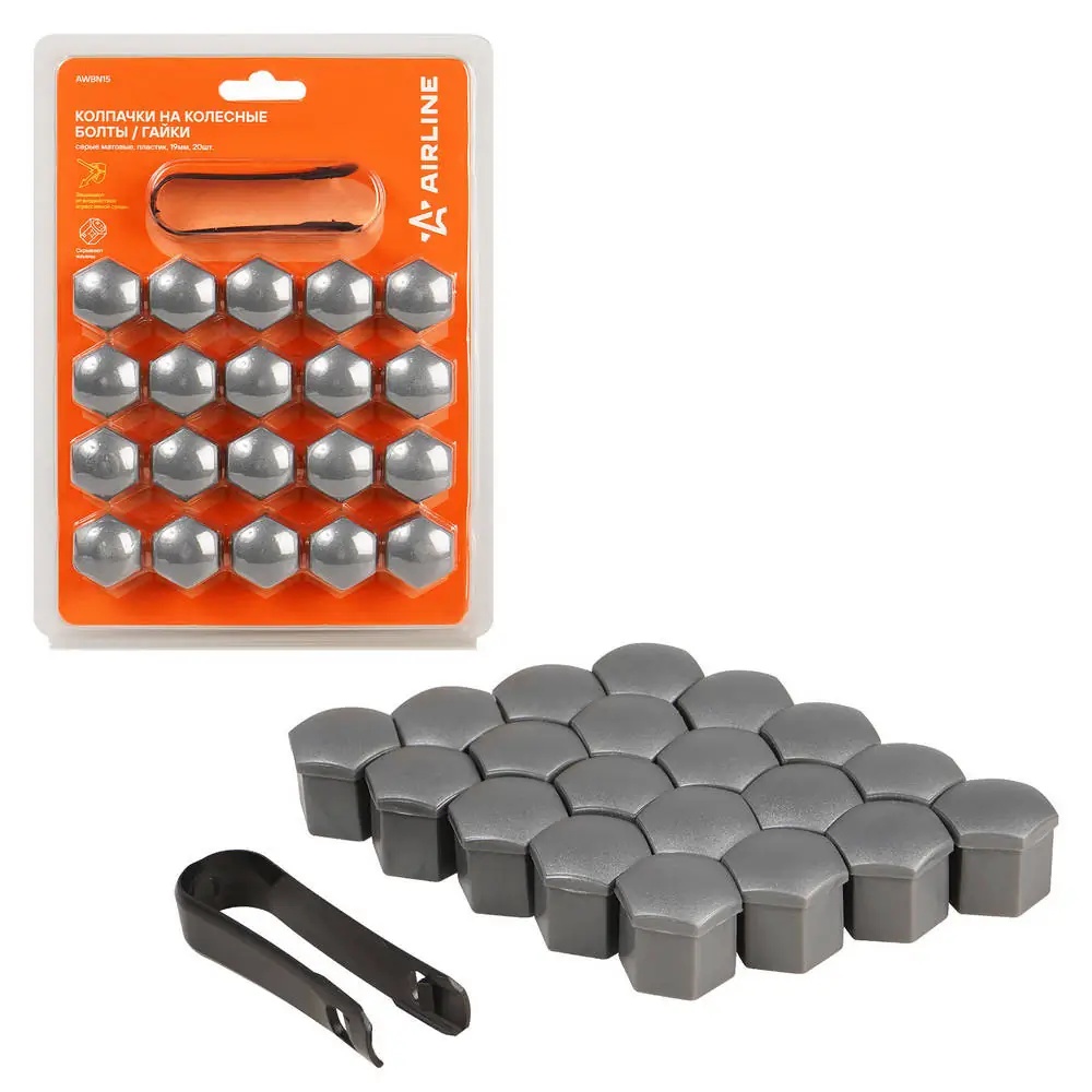 AWBN15 AIRLINE Колпачки на колесные болты/гайки 19 мм, серые матовые, пластик, 20 шт.+ съёмник