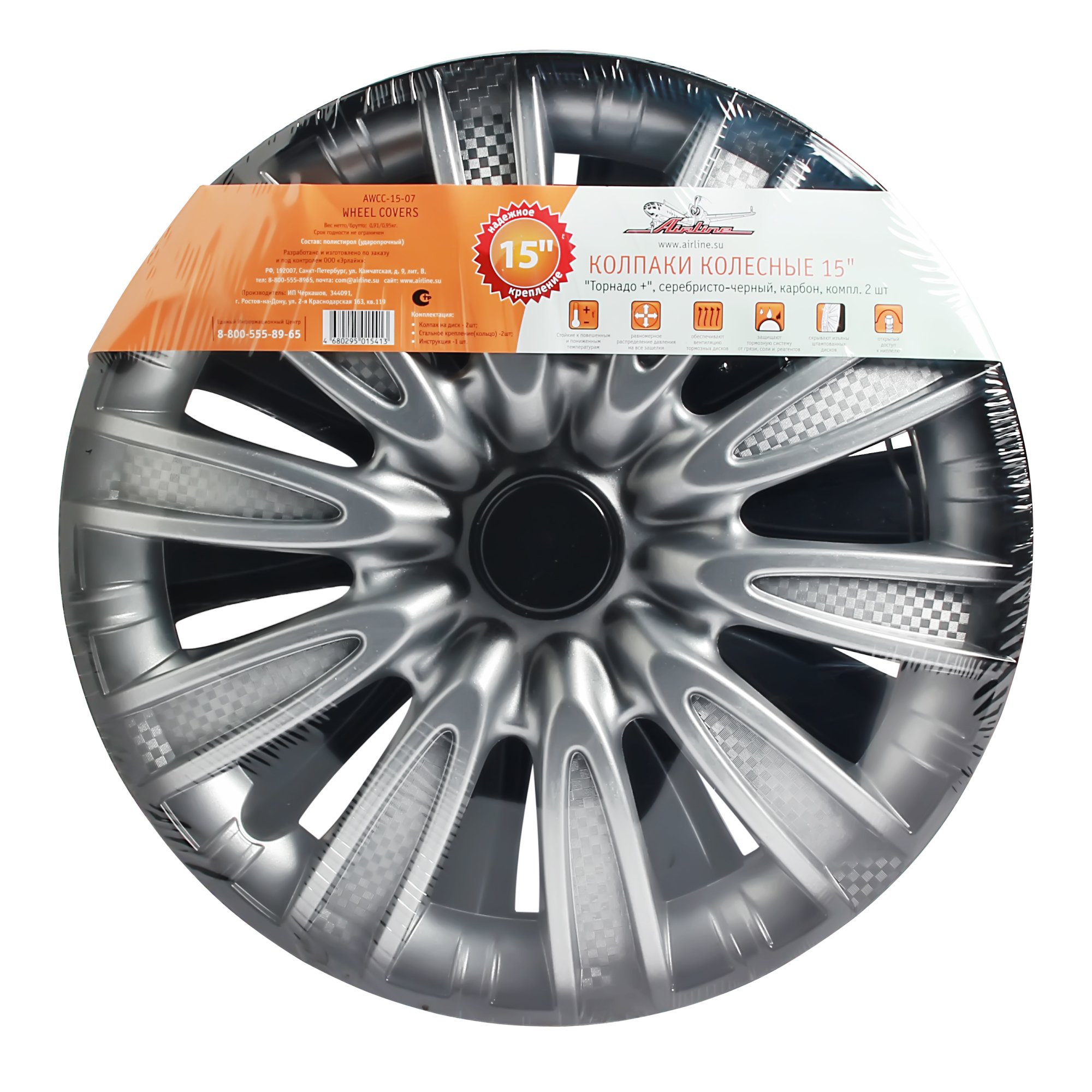 AWCC-15-07 AIRLINE Колпаки колесные 15 Торнадо +, серебристо-черный, карбон, компл. 2 шт. (AWCC-15-