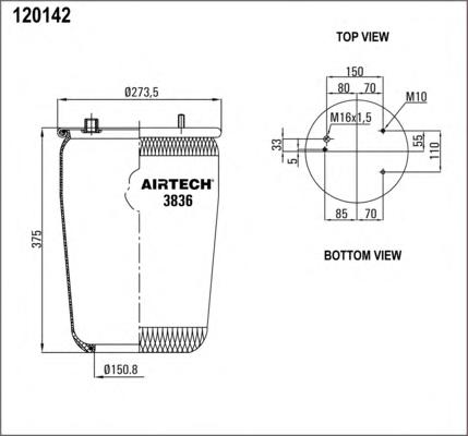 3836P AIRTECH пневмодушка без стак. !без отбойн. 836M 3шп.M10 1отв-шт.M16 смещ.28 Н:1отв.D150.