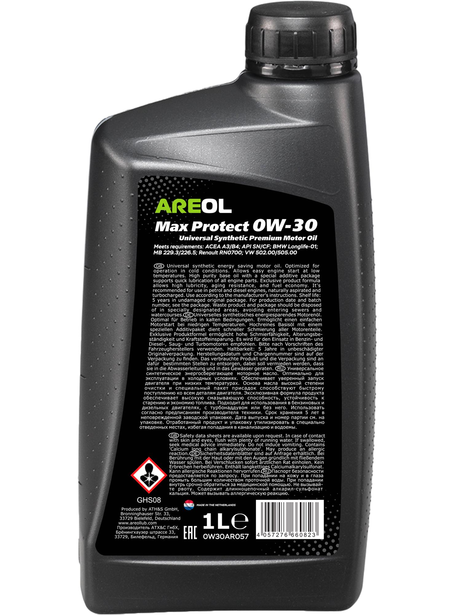 0W30AR057 AREOL AREOL Max Protect 0W30 (1L) масло моторное! синт ACEA A3/B4, API SN/CF, MB 229.3