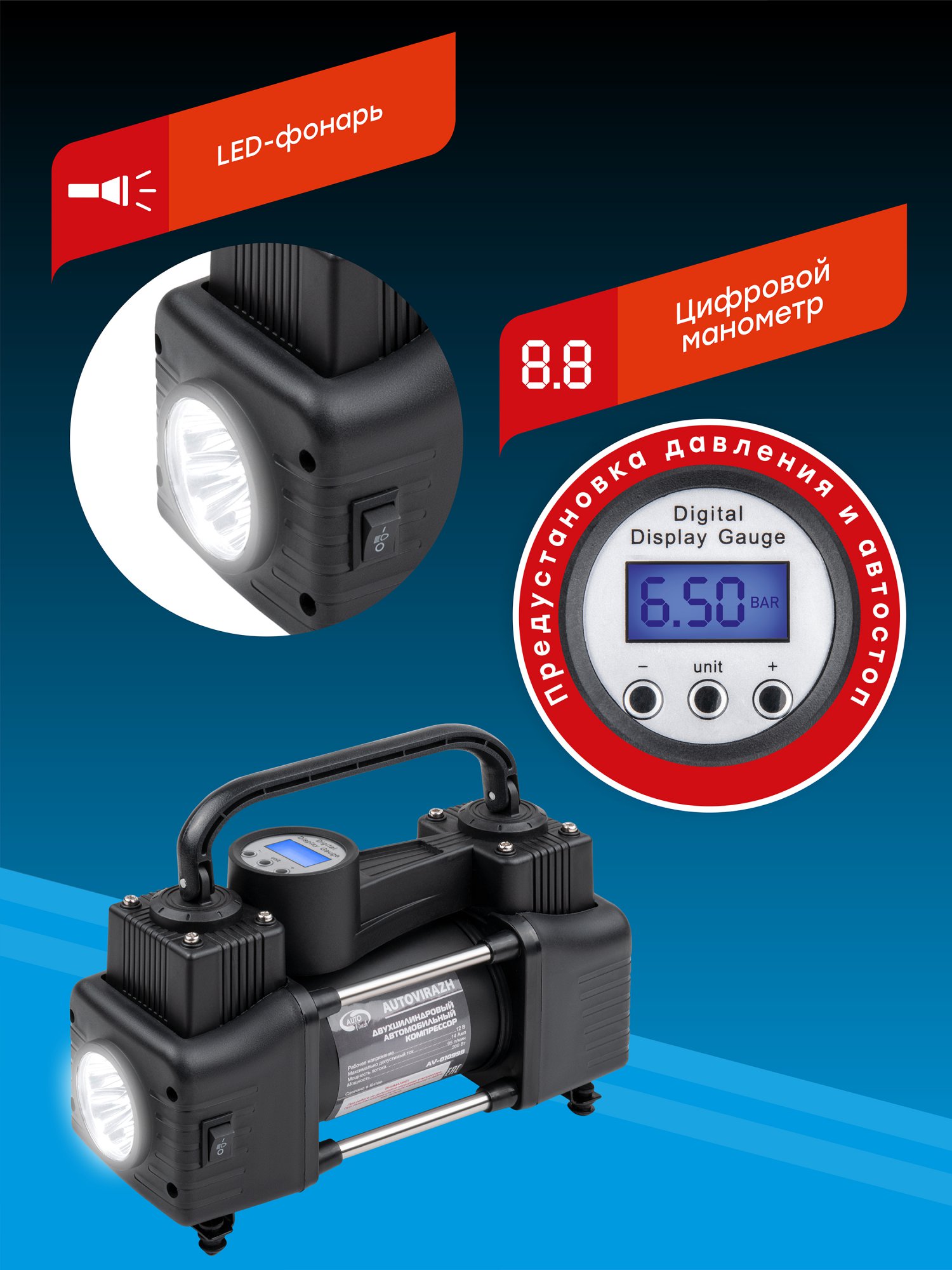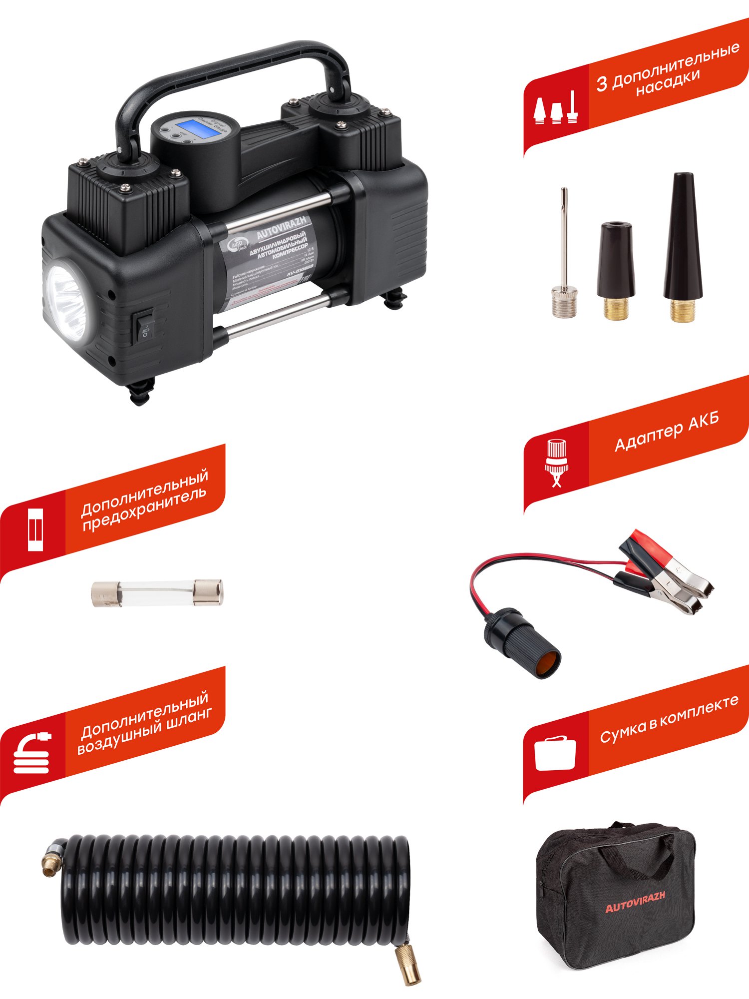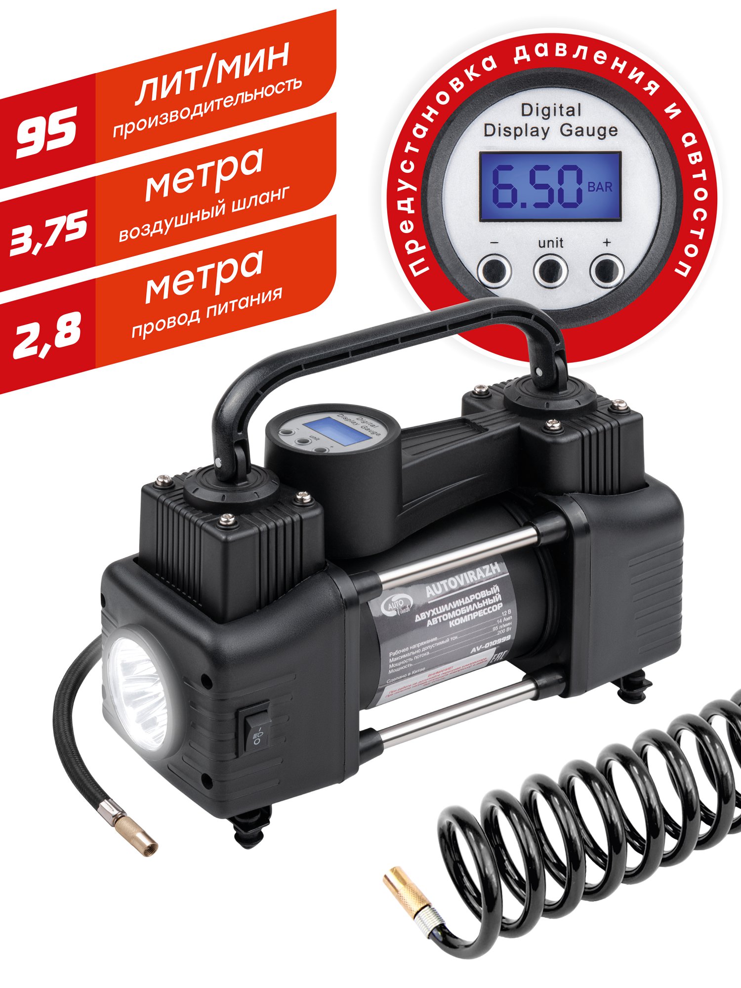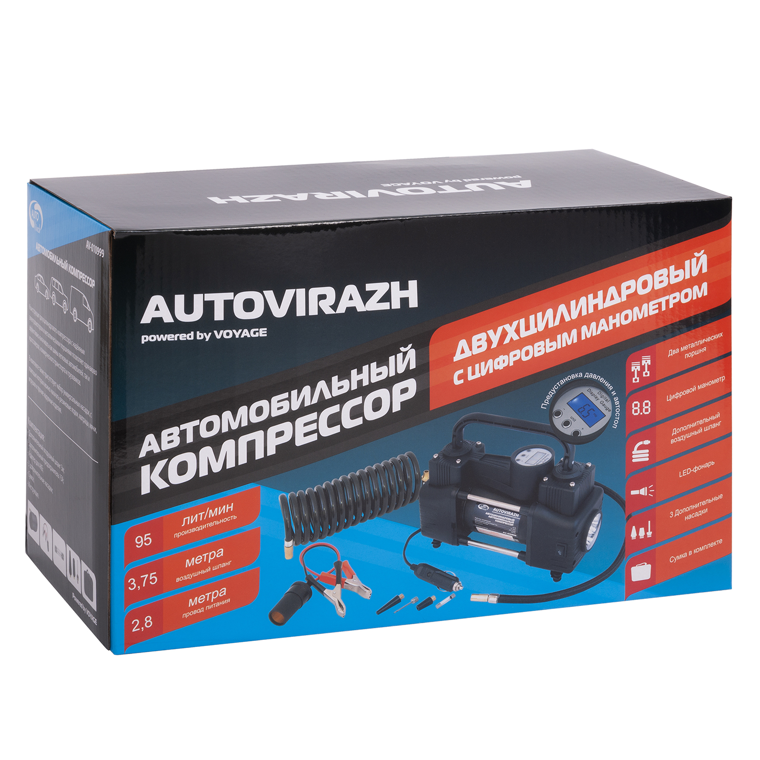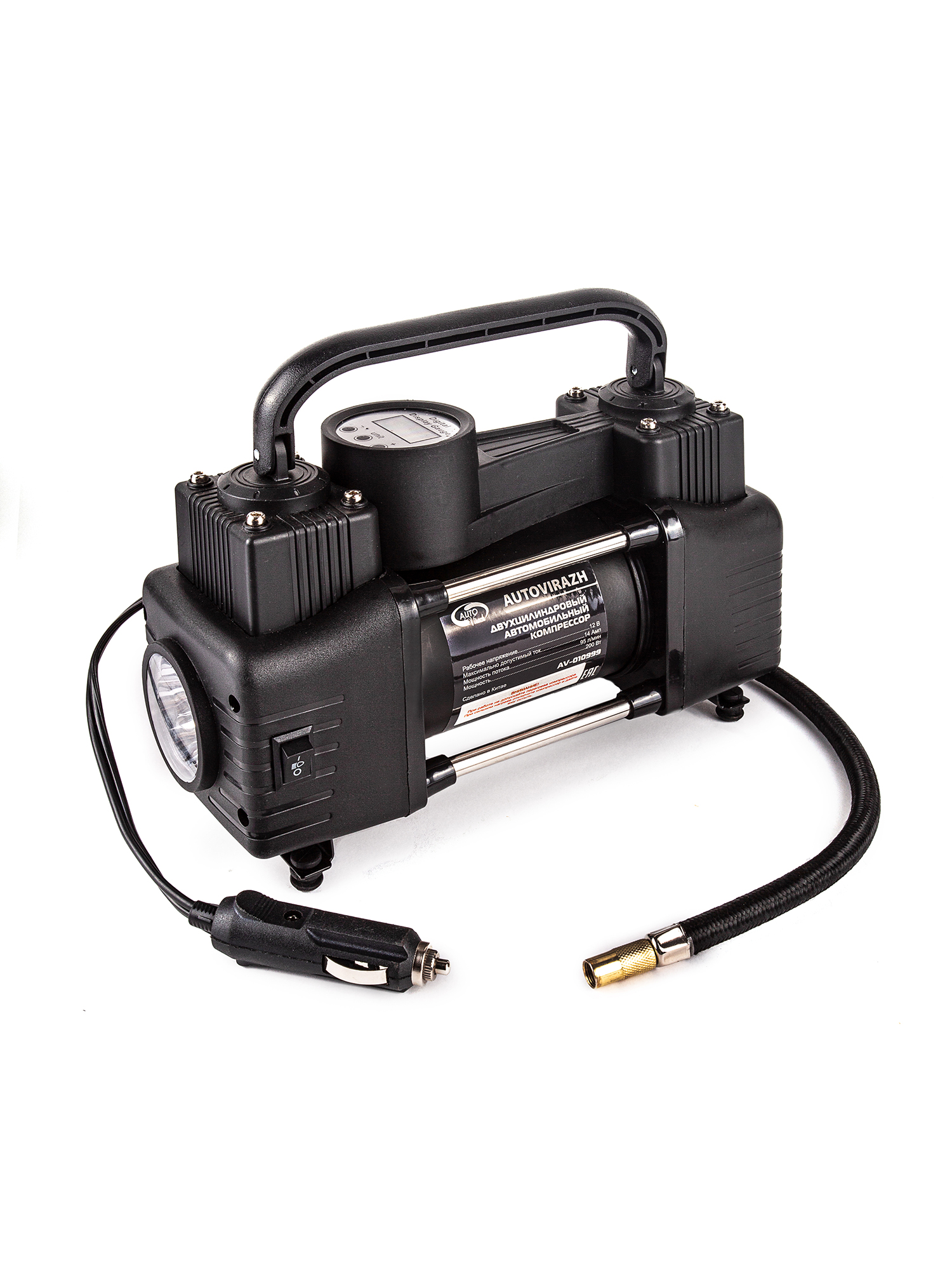 AV-010999 AUTO VIRAZH Компрессор автомобильный 95л/мин. 10атм. 14А 12V в прикуриватель(переходник на к