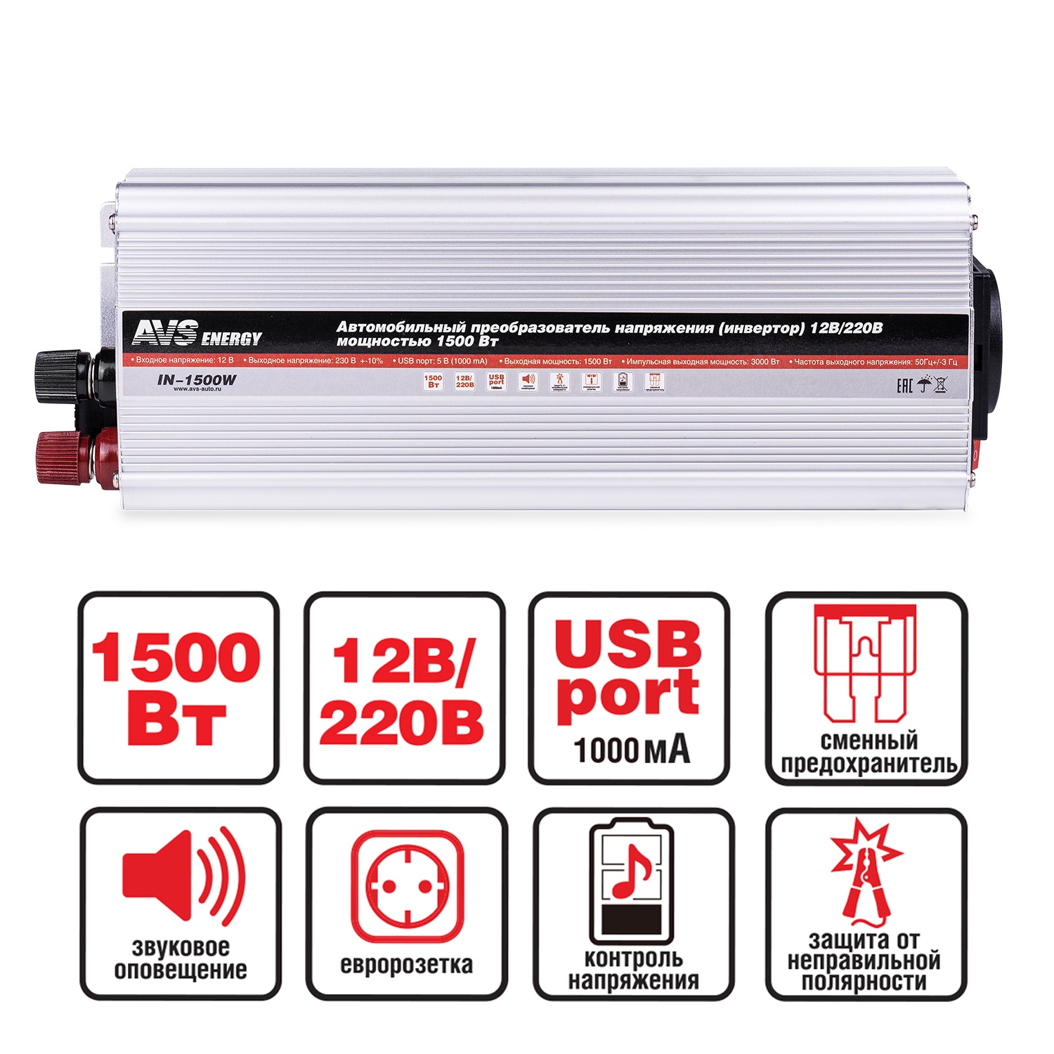 | Наименование | Преобразователь напряжения (инвертор) 12-220V 1500Вт AVS |