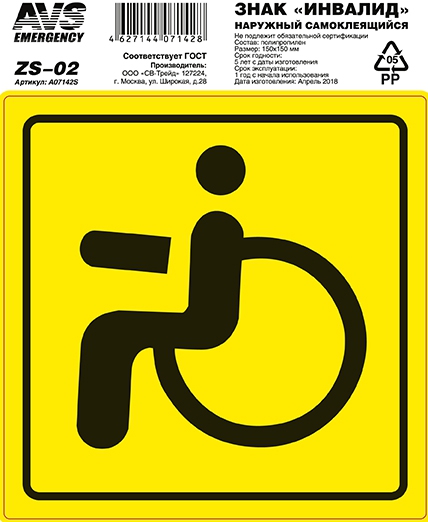 A07142S AVS знак! 'инвалид' ГОСТ наруж.самоклеящ. 150x150 инд.упак.1 шт.\