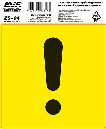 A07144S AVS знак! 'начинающий водитель' ГОСТ наруж.самоклеящ. 150x150 инд.упак.1 шт.\
