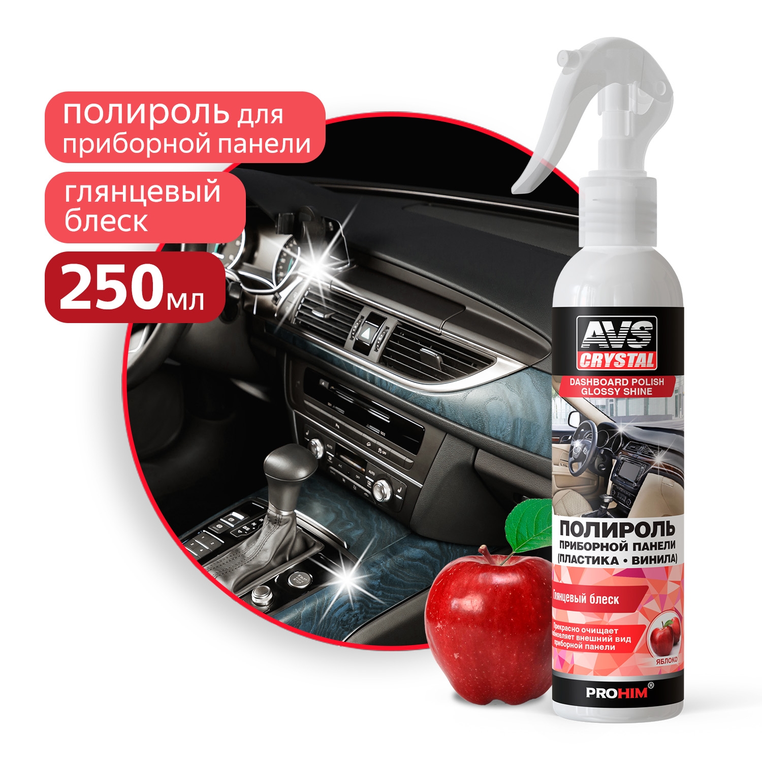 A07479S AVS Полироль пластика глянцевый 250мл яблоко триггер AVS CRYSTAL