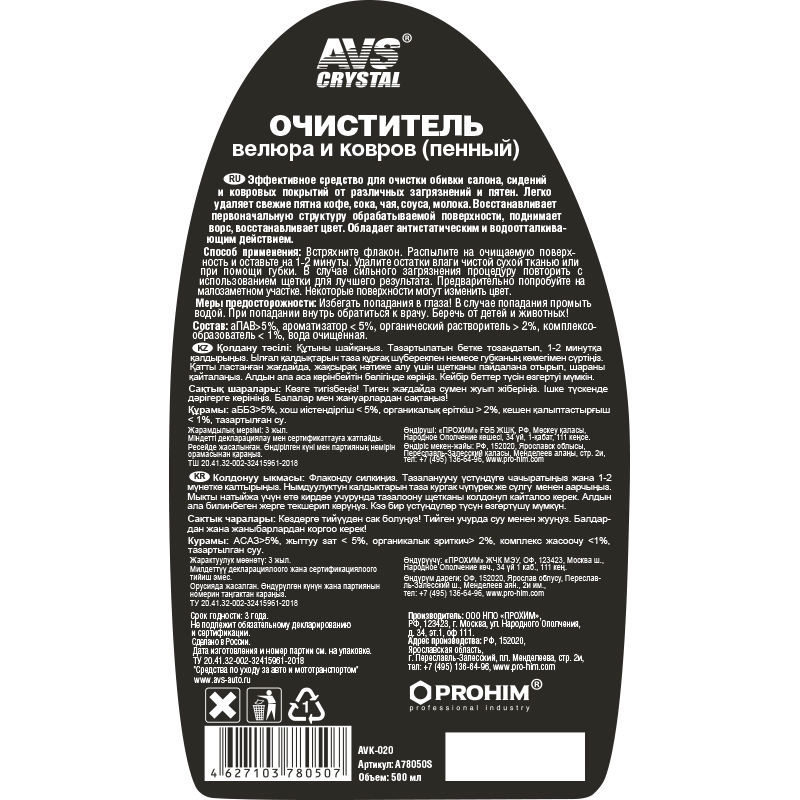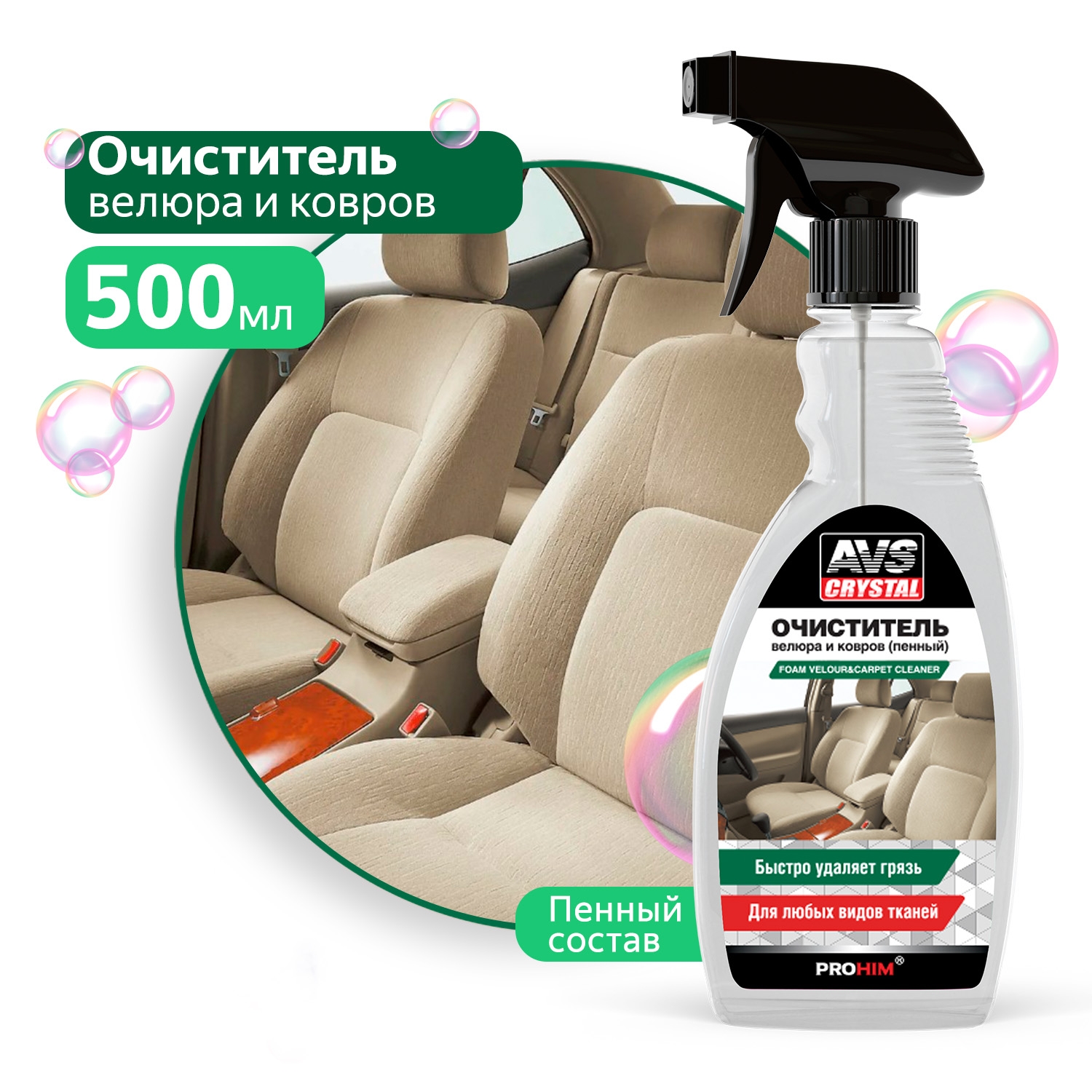 | Наименование | Очиститель обивки салона триггер 500мл AVS CRYSTAL |