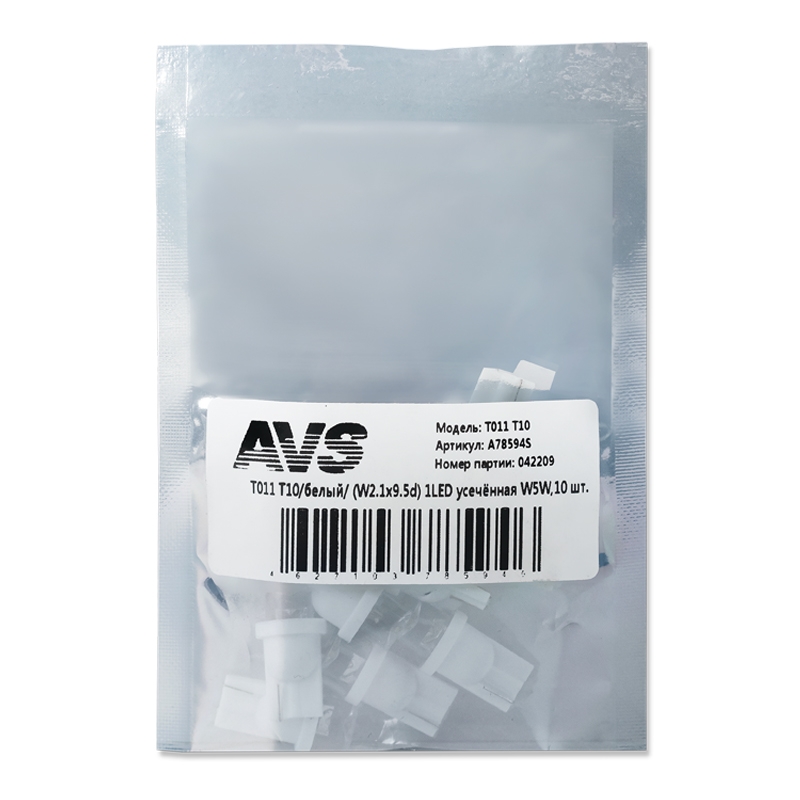 A78594S AVS к-т ламп! светодиодных T011 T10, белый (W2.1x9.5d) 1LED усечённая W5W, 10шт\