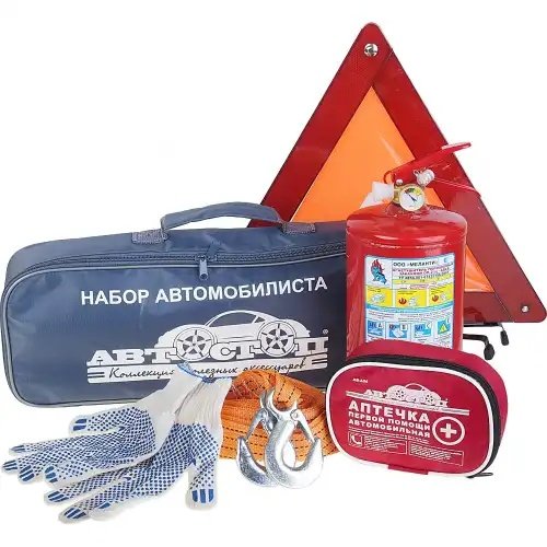 | Наименование | Набор автомобилиста (огнетушитель ОП-2,аптечка,знак,трос 3.5т,перчатки) АВТОСТОП |
