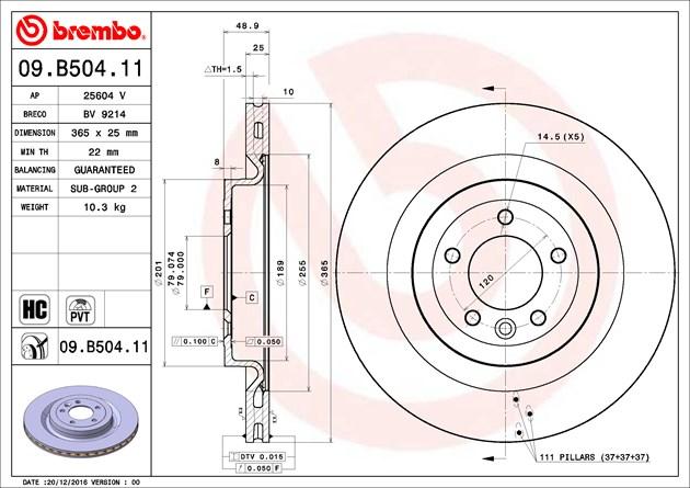 09.B504.11 BREMBO Диск тормозной LAND ROVER RANGE ROVER IV (L405) 08/12 задн. 09.B504.11