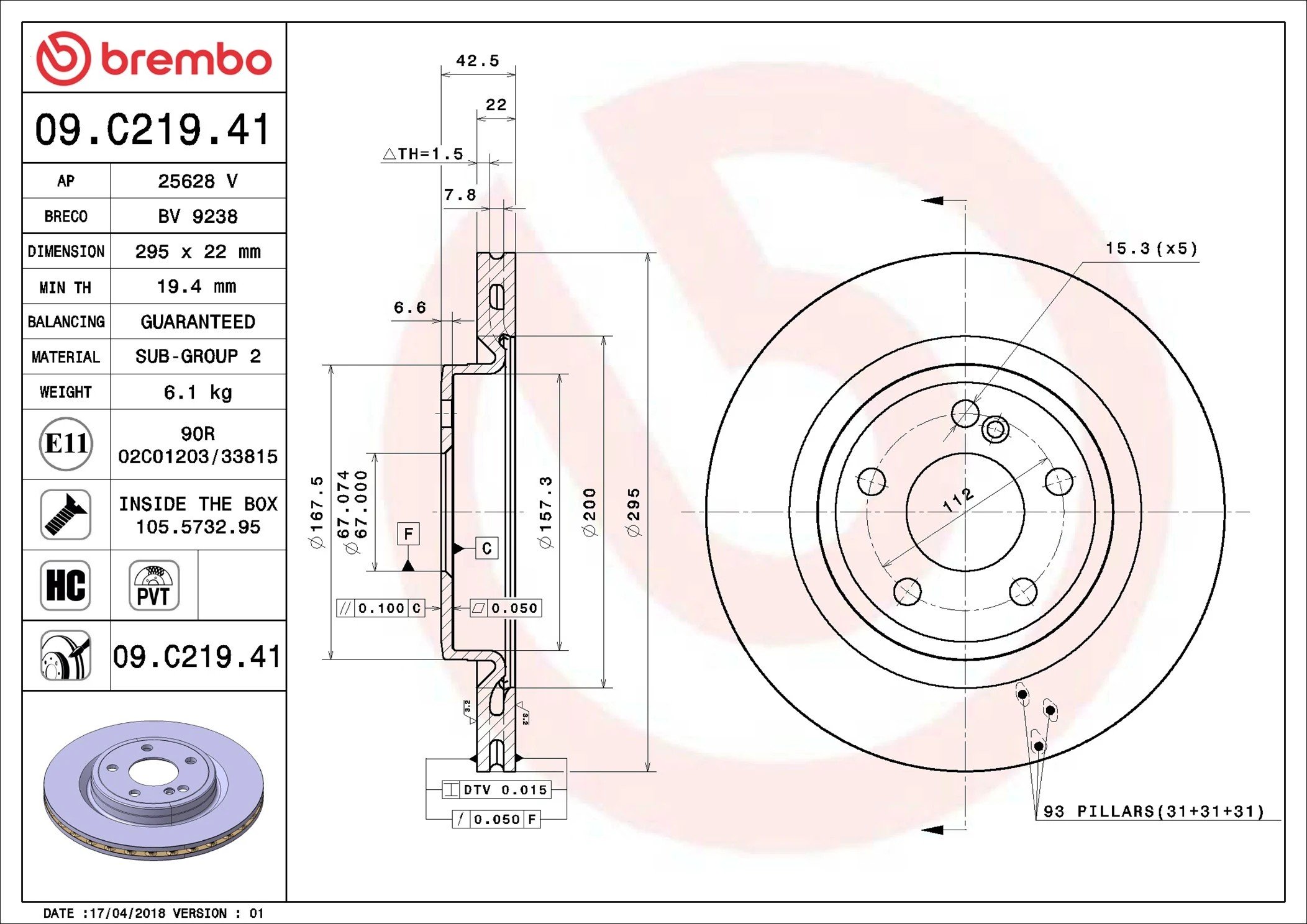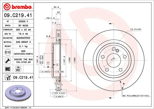 09.C219.41 BREMBO Диск тормозной MB A-CLASS (W176) 06/12 задн. 09.C219.41