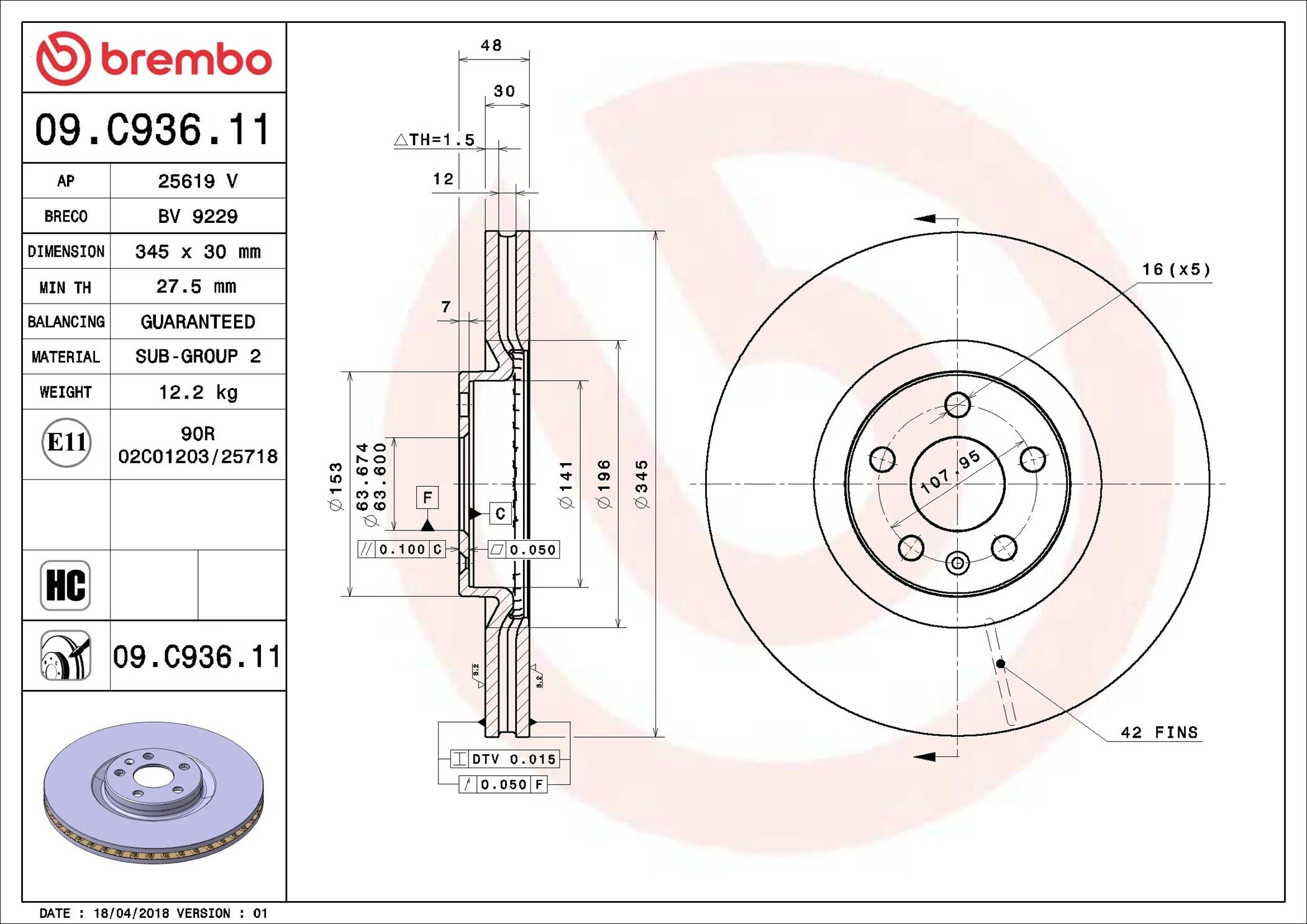 09.C936.11 BREMBO Диск тормозной VOLVO XC60 II (246) 03/17 перед 09.C936.11