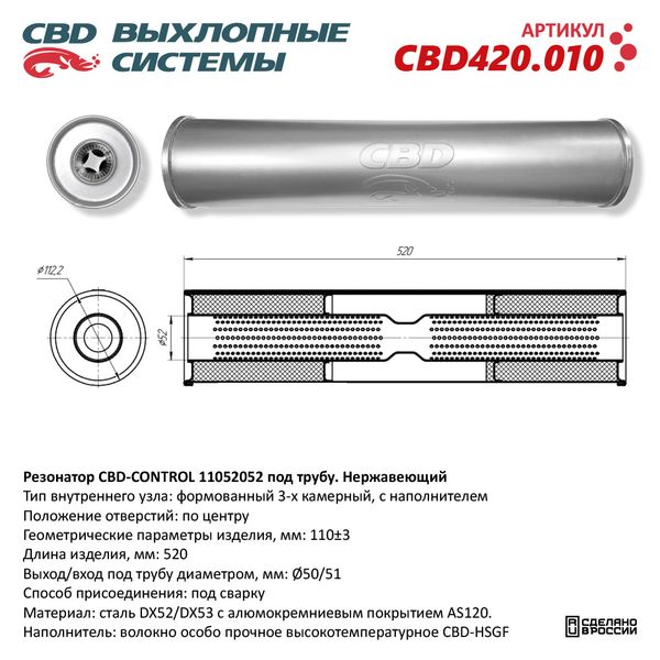 CBD420.010 CBD Резонатор универсальный d=52,L=520мм (внешн. d=110мм) под трубу нержавеющая стал