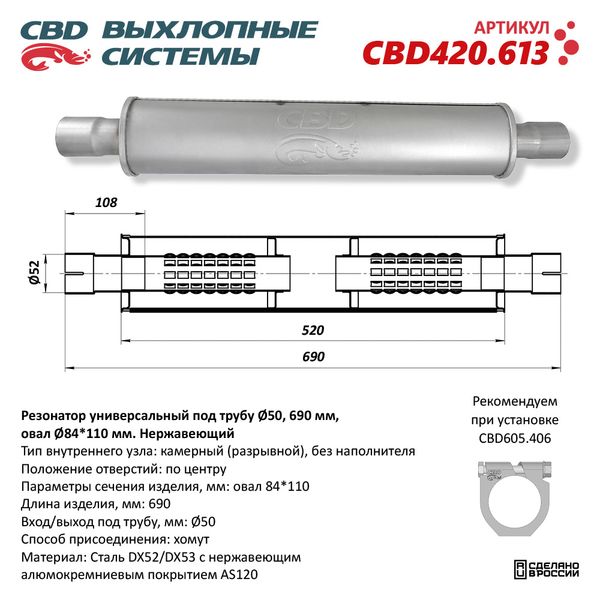 CBD420.613 CBD Резонатор универсальный овальный d=84х110мм L=690 (под трубу 50мм) нержавеющая с